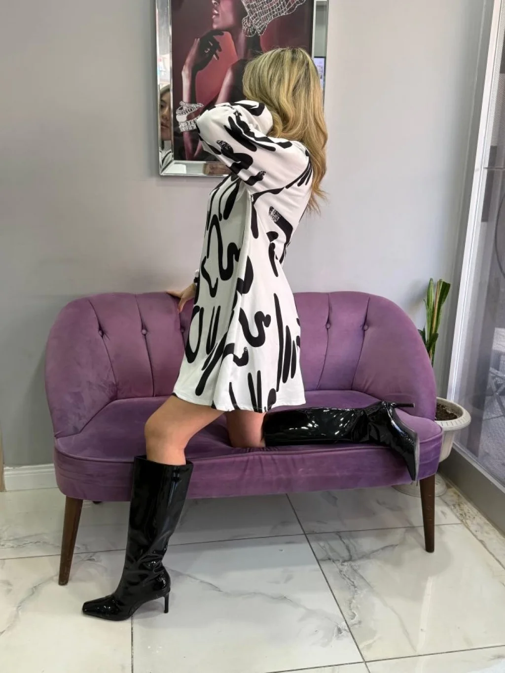 Kadın Uzun Kollu Yarı Balıkçı Yaka Desenli Kısa Dalgıç Elbise