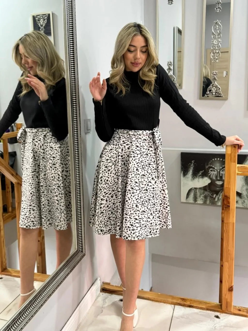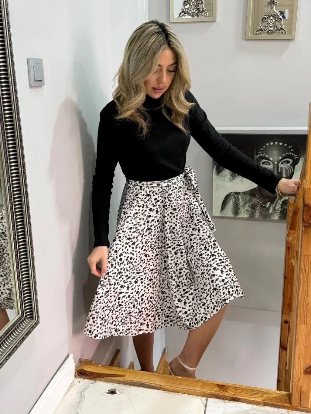 Kadın Uzun Kollu Yakalı Yandan Bağlamalı Mini Desenli Modal Elbise