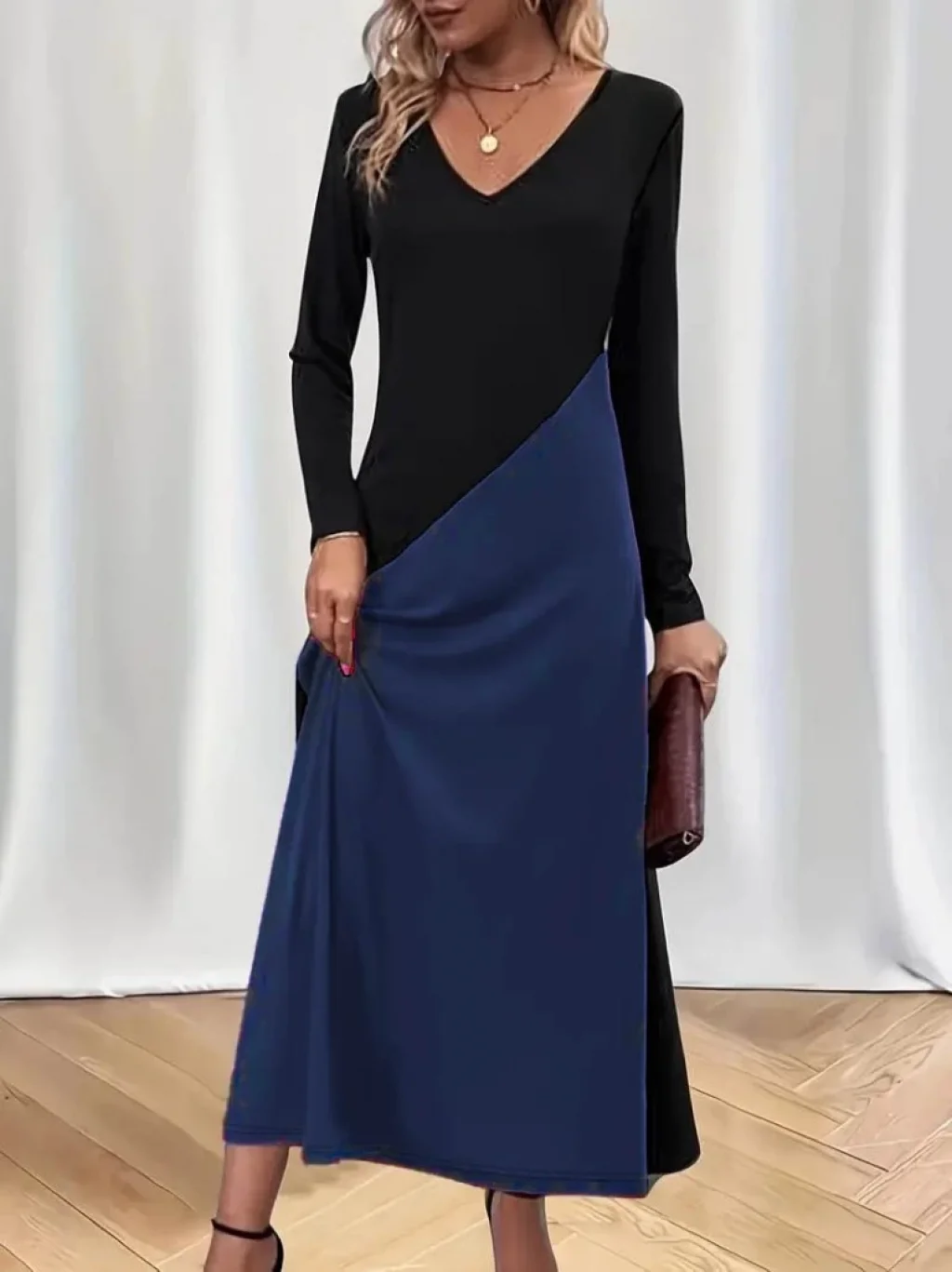 Kadın Uzun Kollu V Yakalı Blok Desenli Viskon Elbise