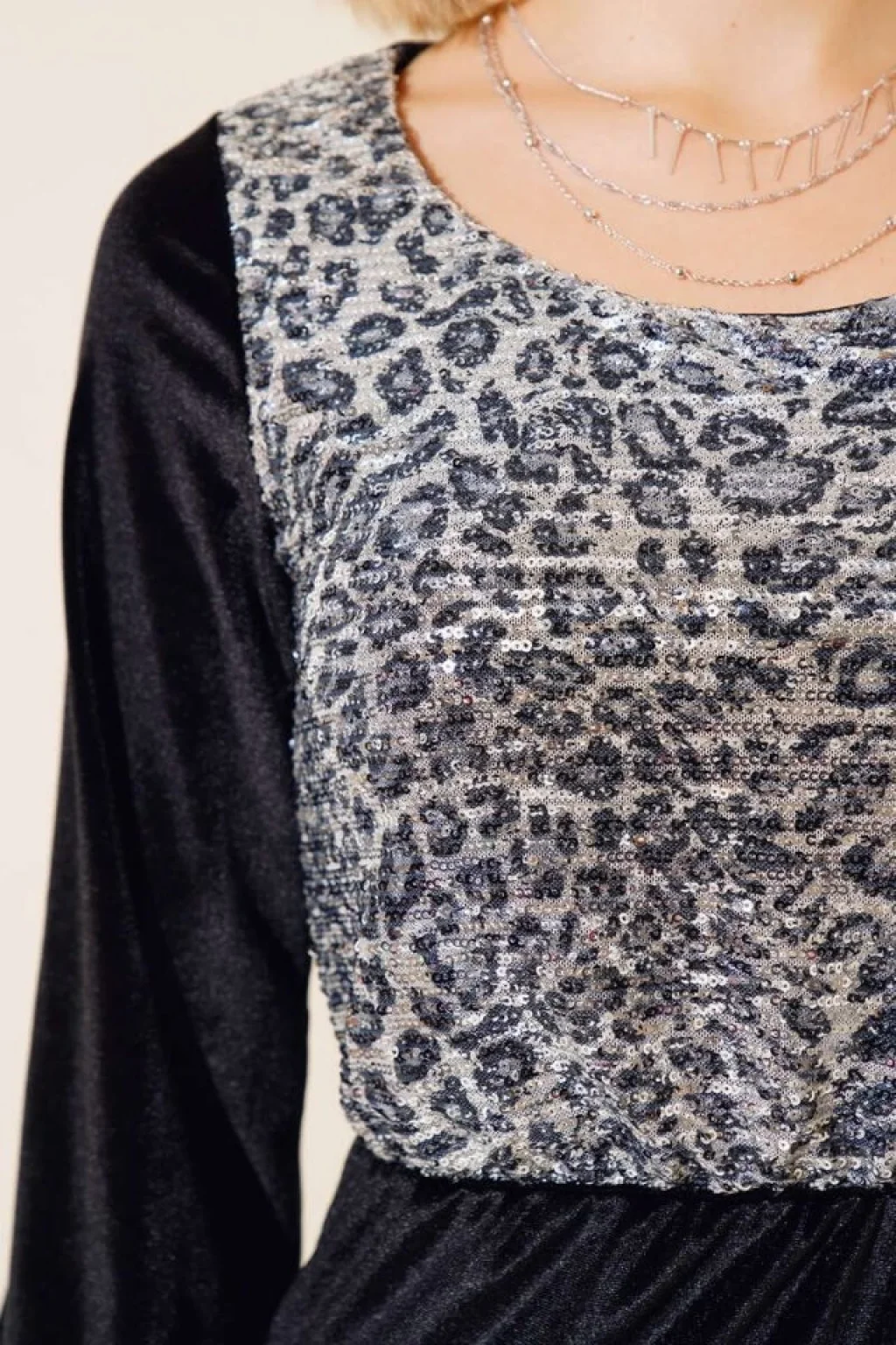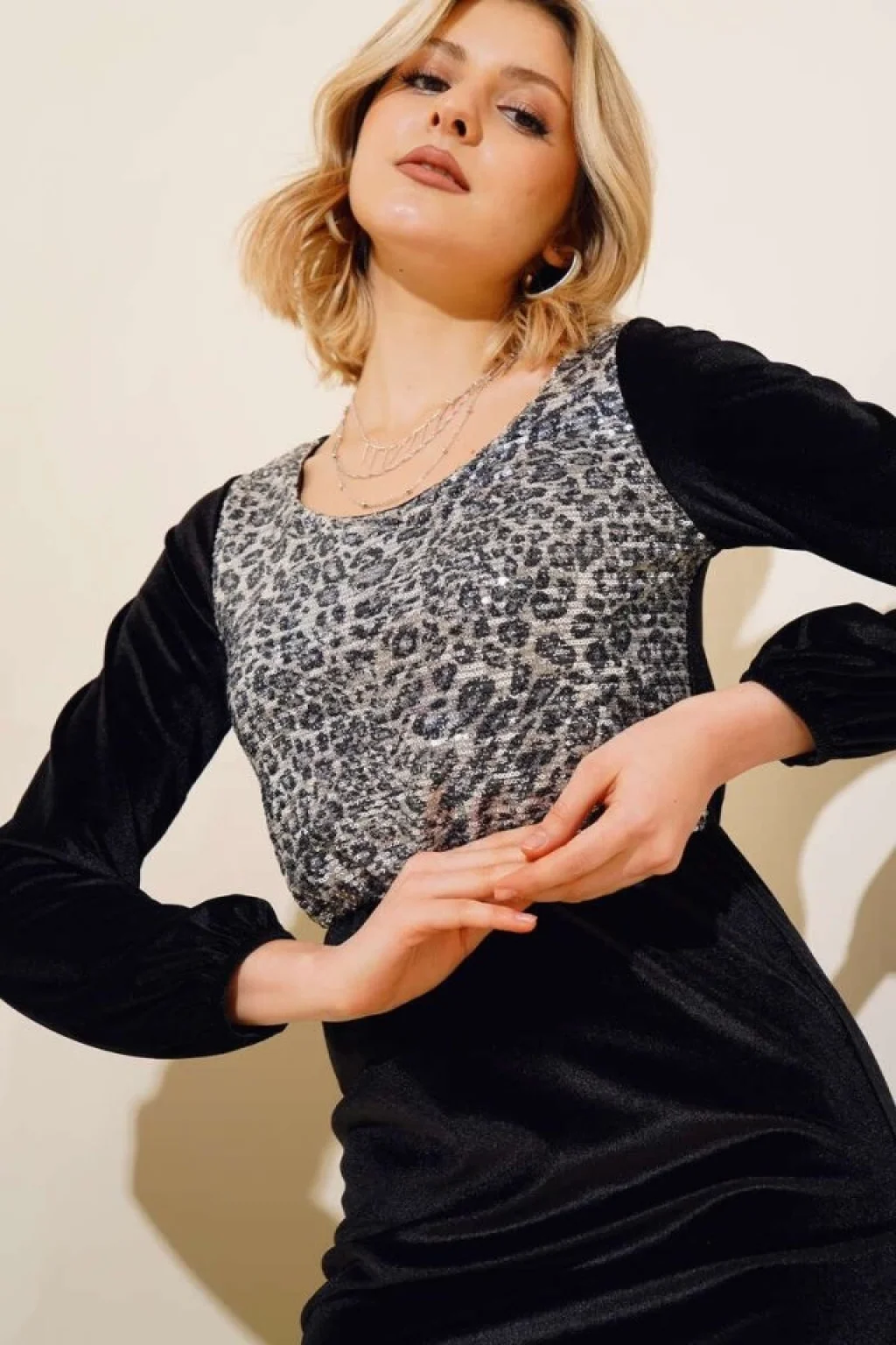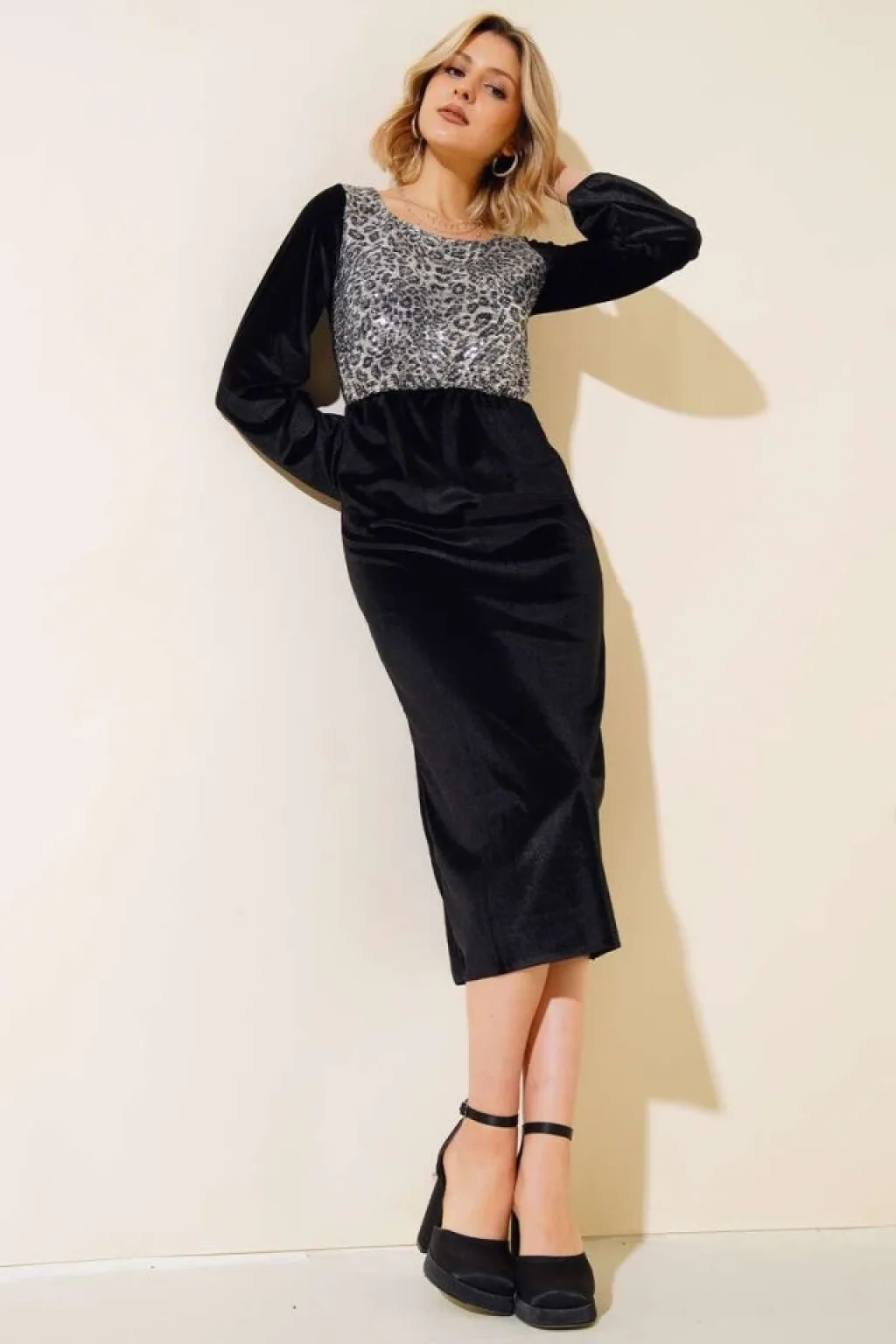 Kadın Fırsat ürünü Leopar Desen Pul Payet Işlemeli Midi Boy Kadife Kumaş Elbise