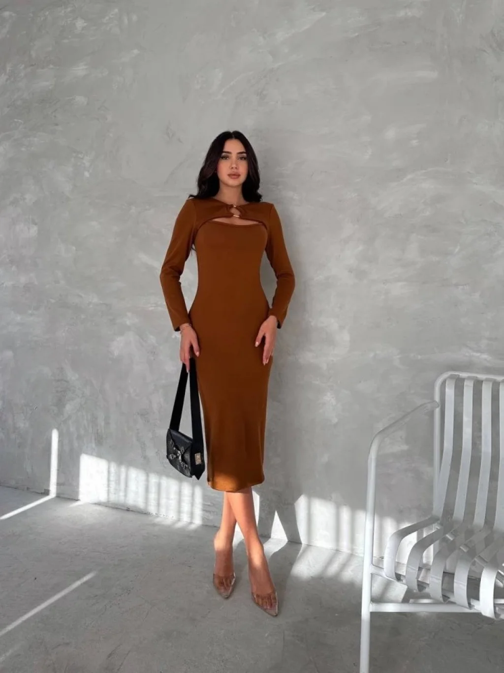 Kadın Uzun Kollu Halka Ve Pencere Dekolte Detay Fırsat ürün Midi Boy Elbise
