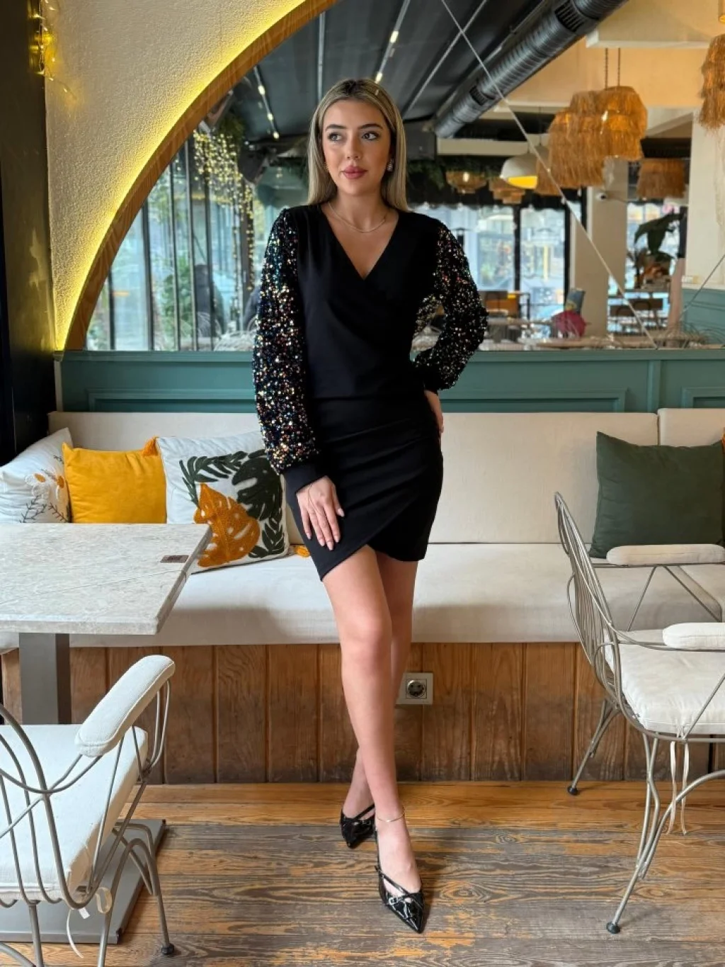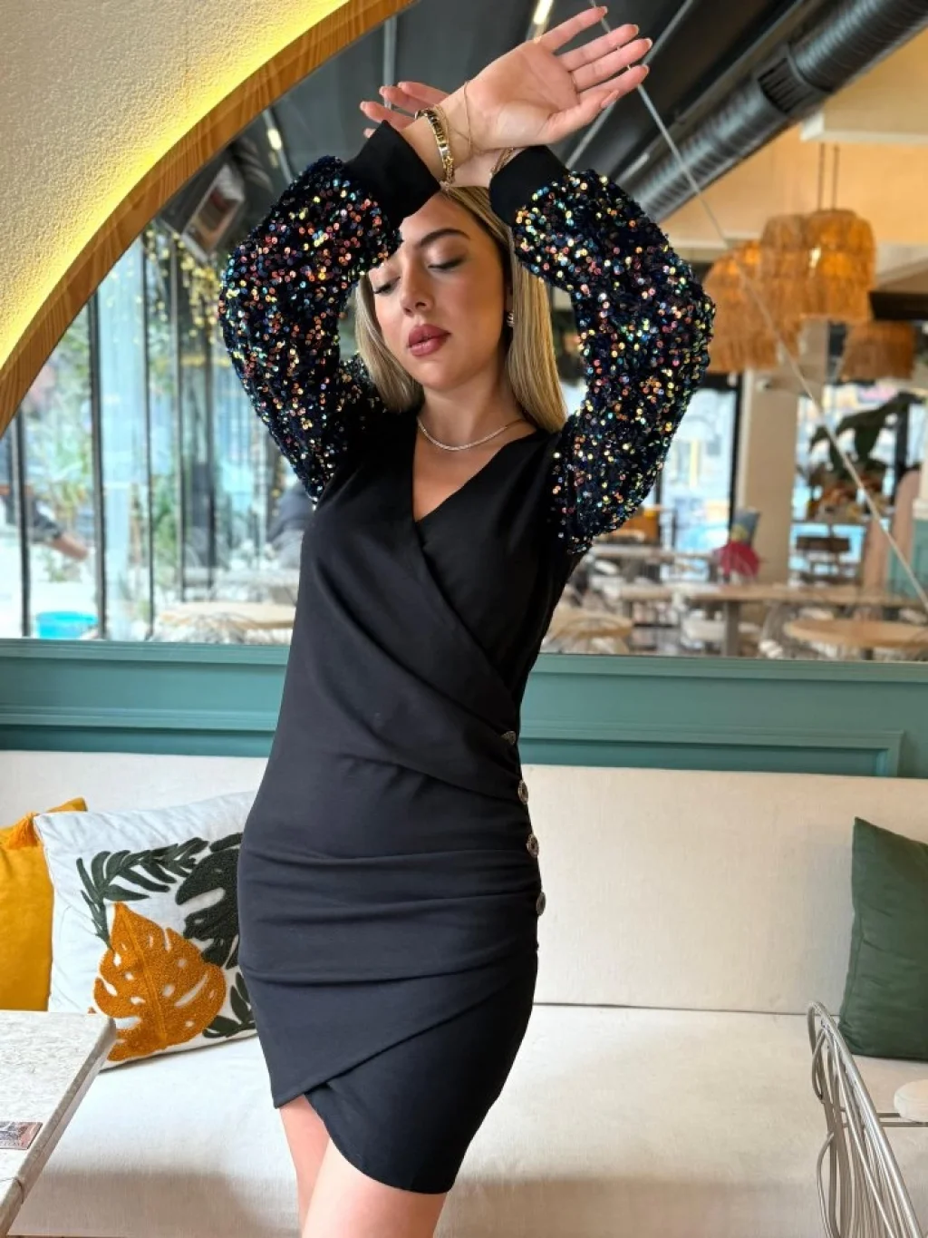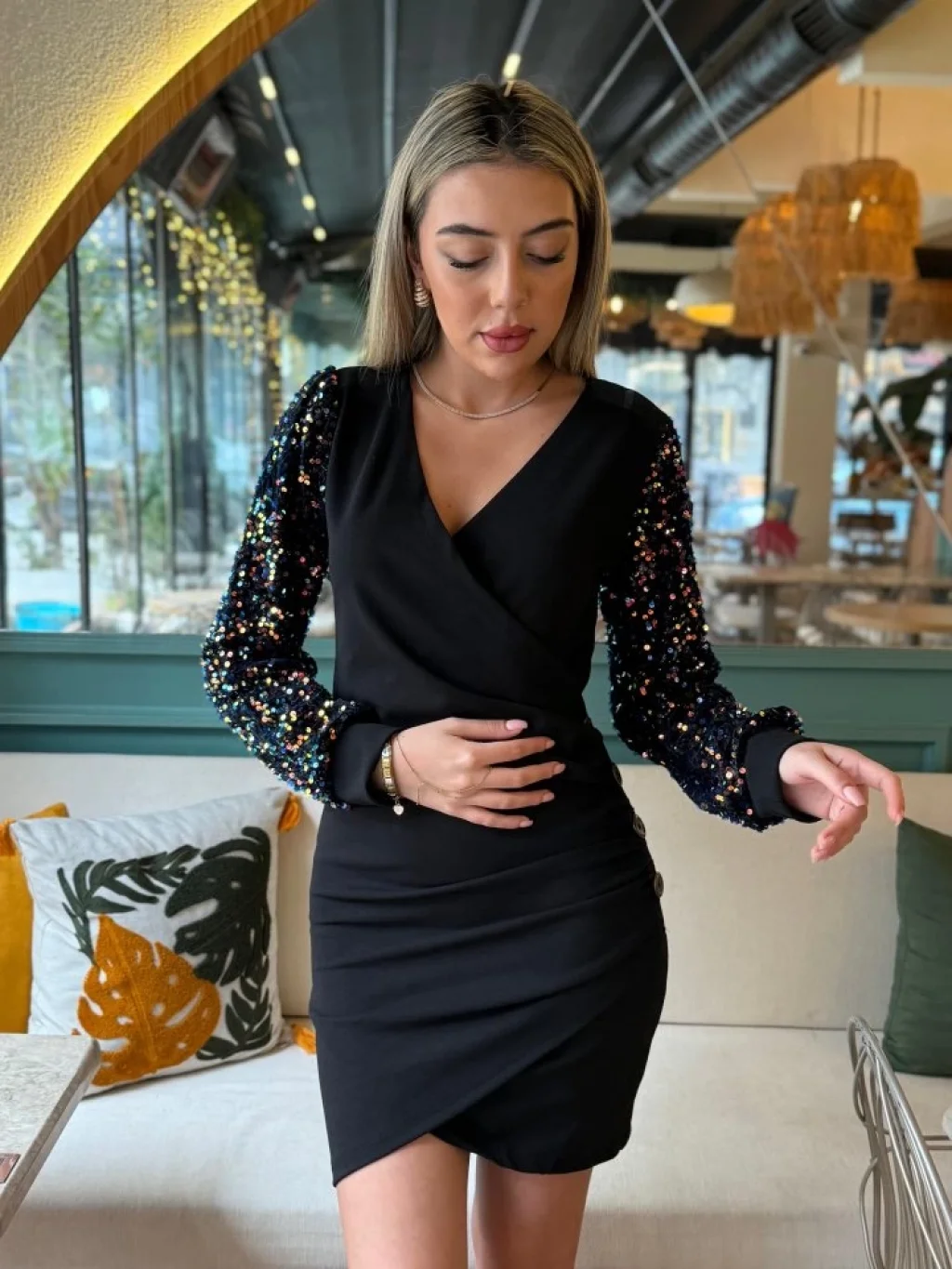 Kadın Uzun Kollu Pul Payetli Kruvaze Yaka Yandan Düğmeli Kısa Ithal Krep Elbise