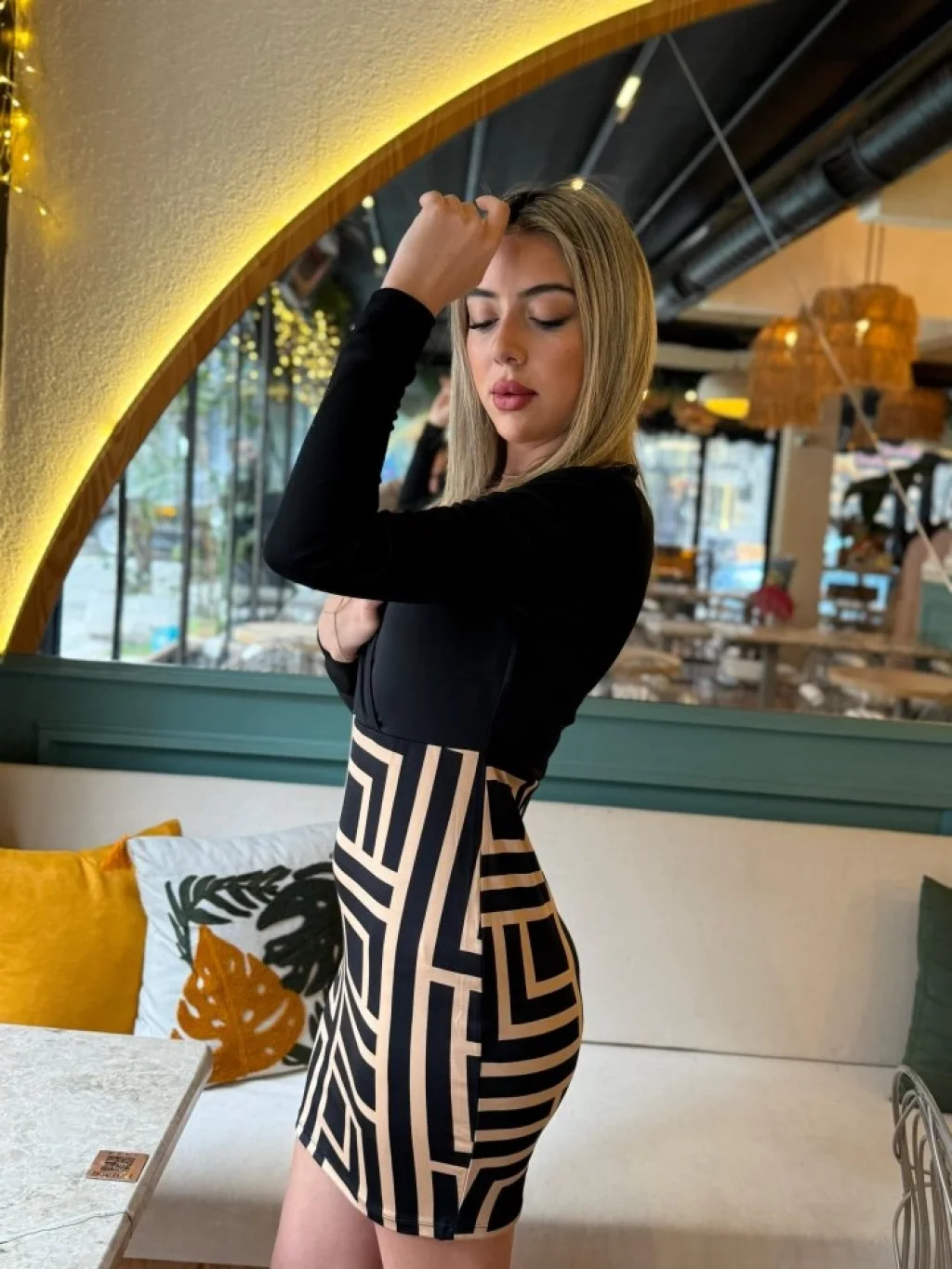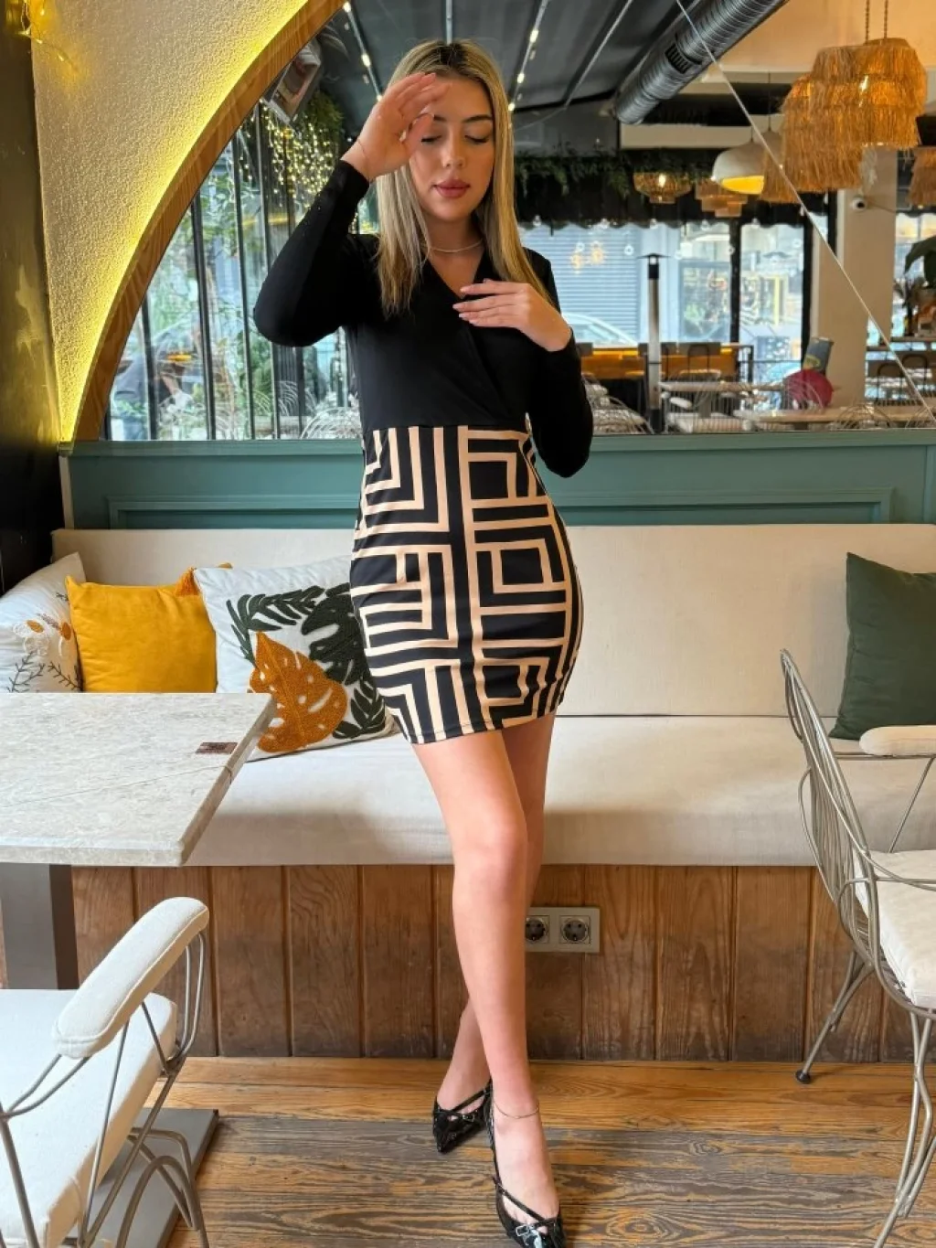 Kadın Uzun Kollu Kruvaze Yaka Labirent Desen Dalgıç Elbise