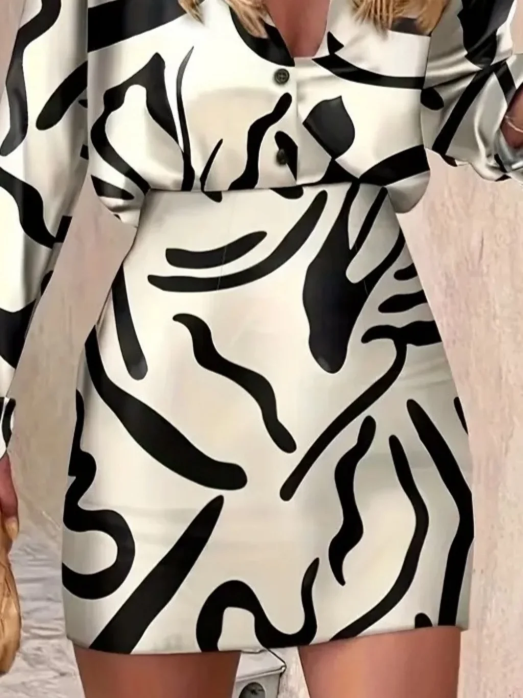 Kadın Uzun Kollu Yakalı Yandan Bağlamalı Mini Desenli Modal Elbise
