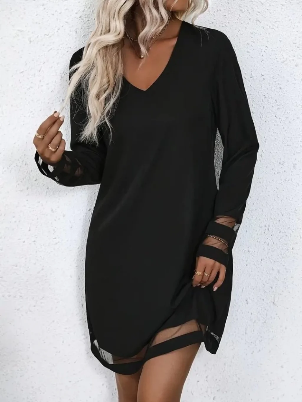 Kadın Uzun Kollu Omuzdan Açık V Dantel Yakalı Mini Waffle Elbise