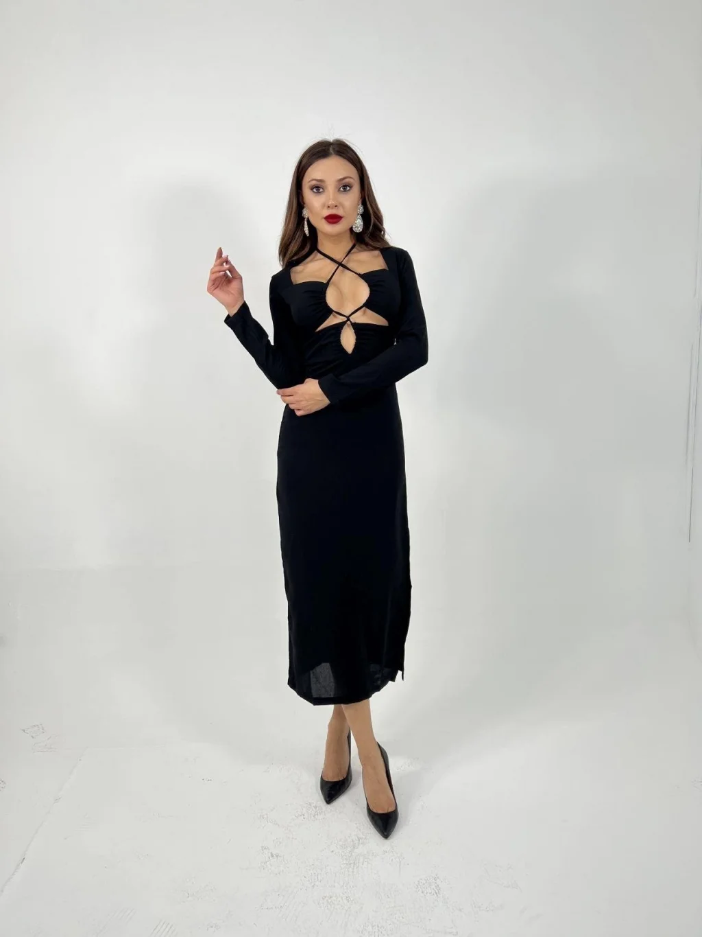 Kadın Uzun Kollu Geometrik Yaka Midi Ithal Krep Elbise