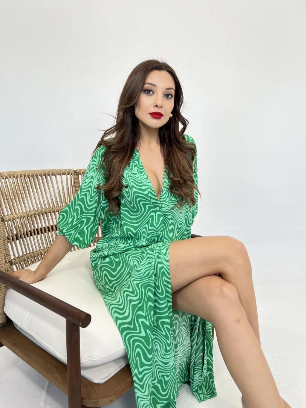 Kadın Uzun Kollu Yakalı Yandan Bağlamalı Mini Desenli Modal Elbise