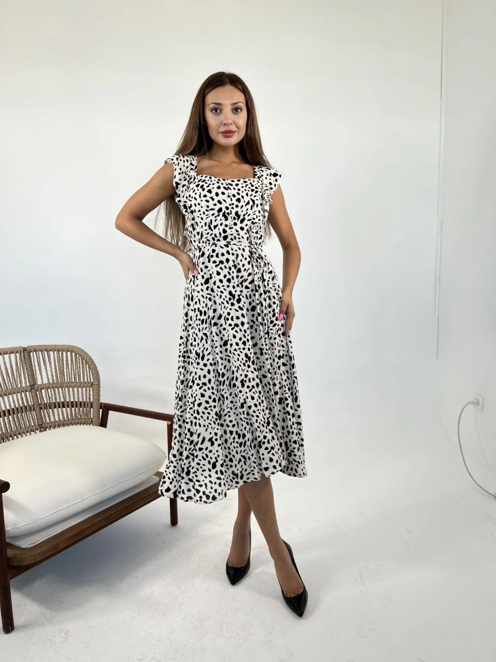 Kadın Uzun Kollu Kruvaze Yakalı Fırfırlı Belden Kuşaklı Leopar Desen Modal Elbise