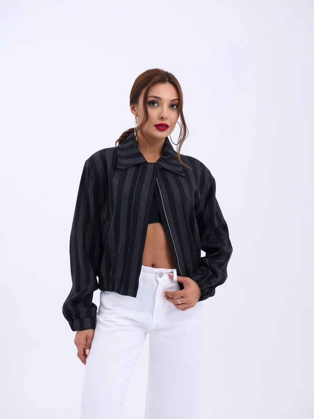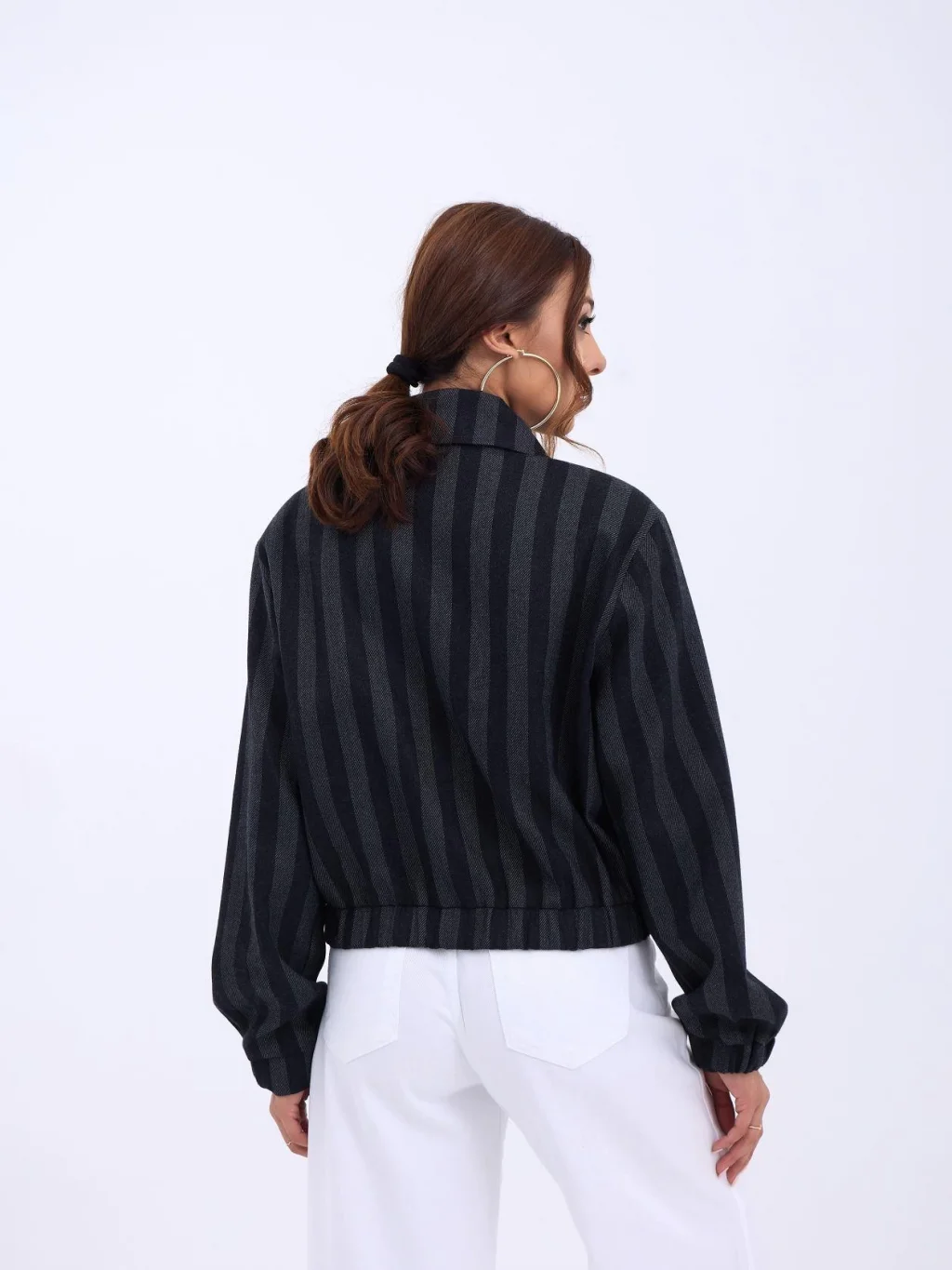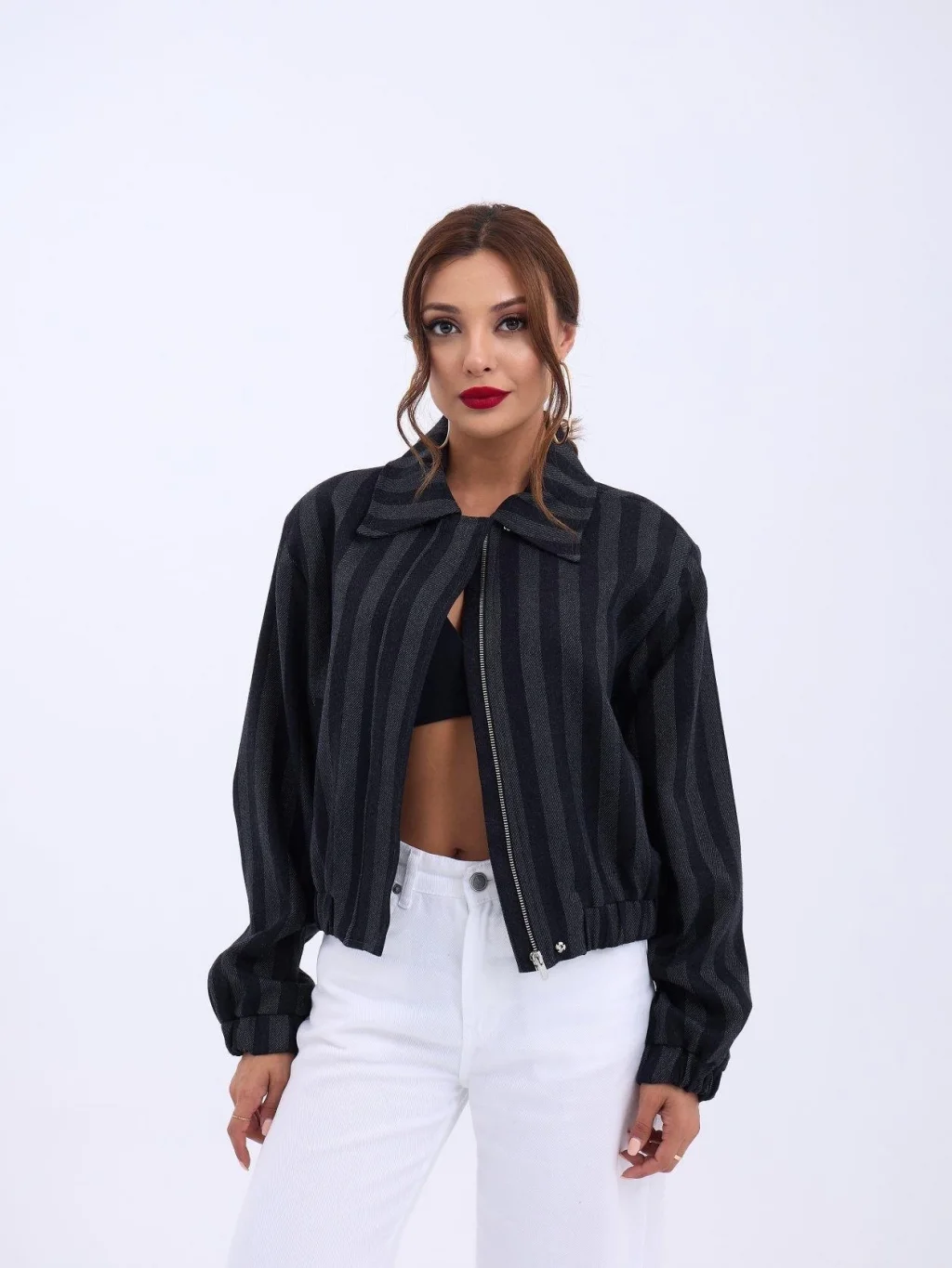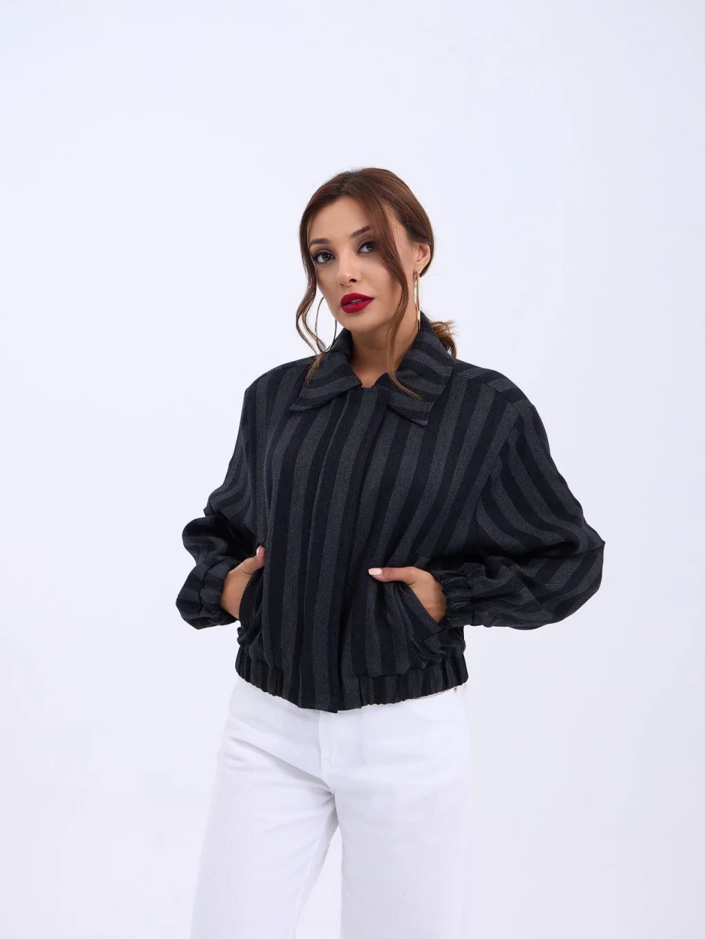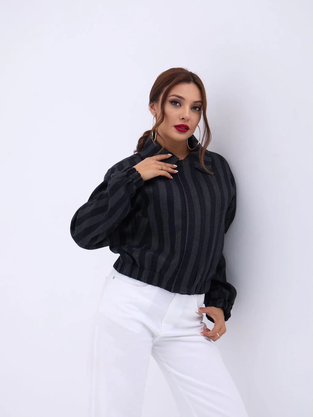 Kadın Uzun Kollu Hakim Yaka Yakadan Fermuarlı Geometrik Desenli Süprem Bluz