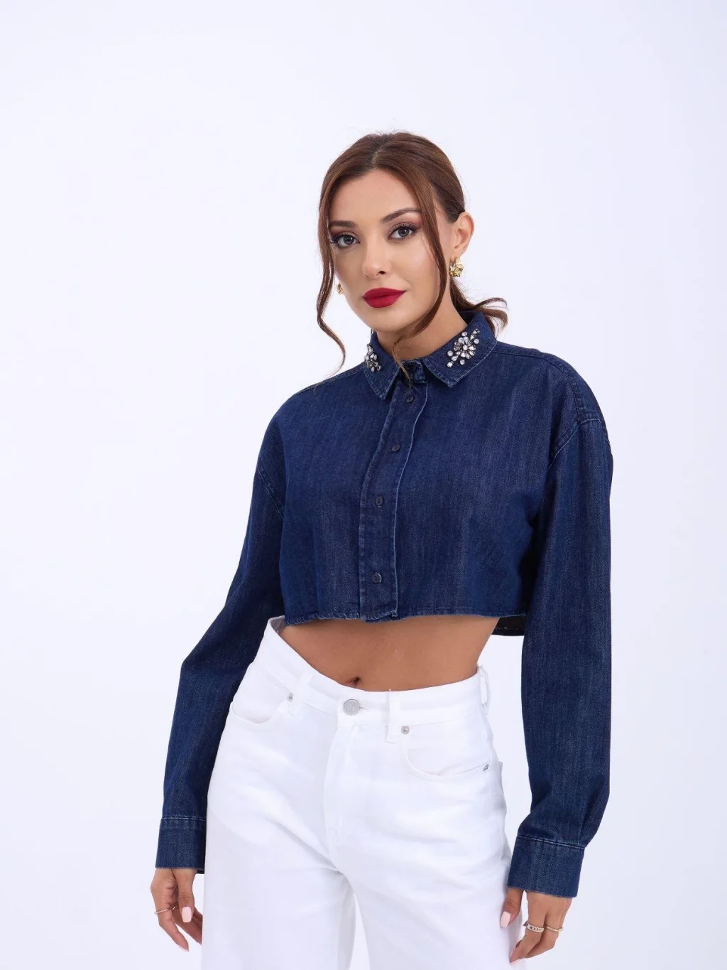 Kadın Uzun Kollu Yarı Balıkçı Yaka Pencere Detaylı Kolları Kalp Desen Taşlı Viskon Bluz