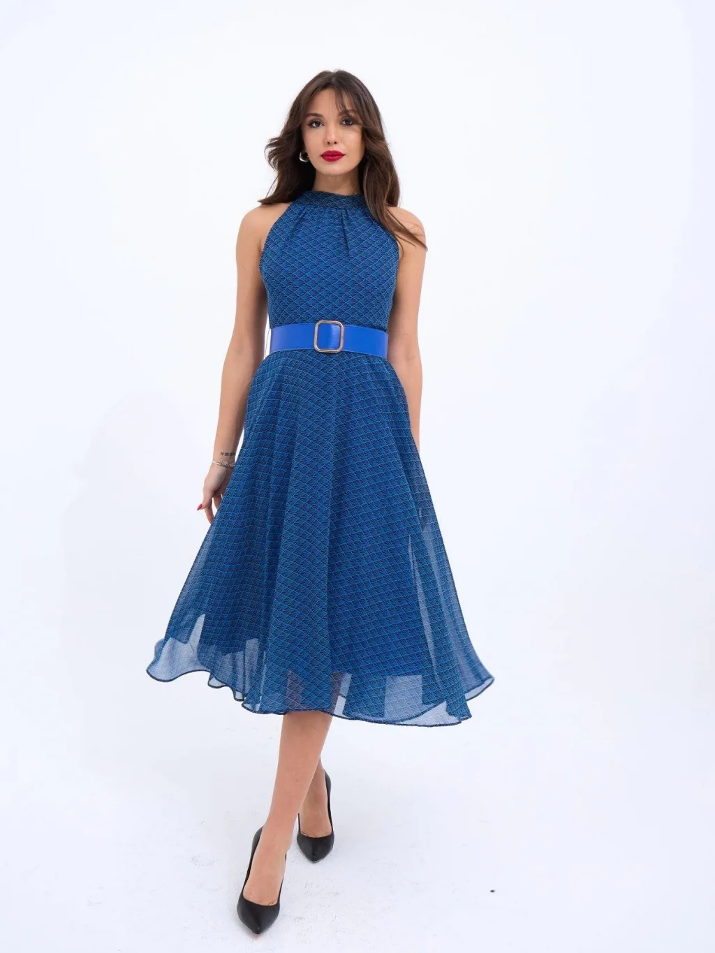 Kadın Uzun Kollu Geometrik Yaka Midi Ithal Krep Elbise