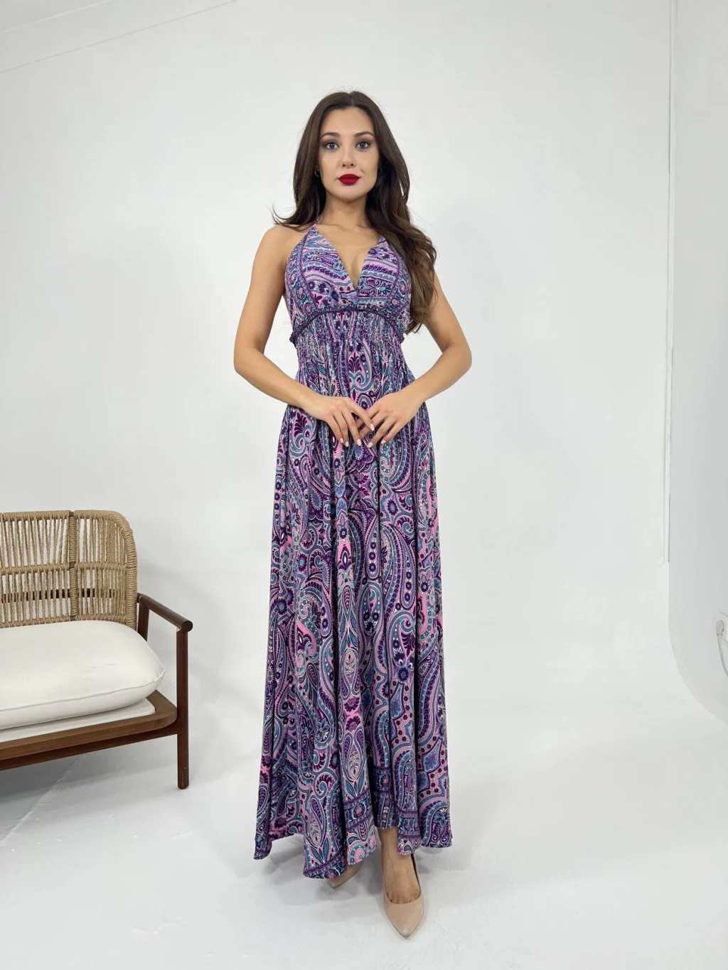 Kadın Uzun Kollu Kruvaze Yakalı Desenli Süprem Maxi Elbise