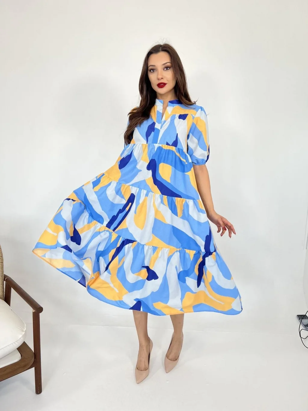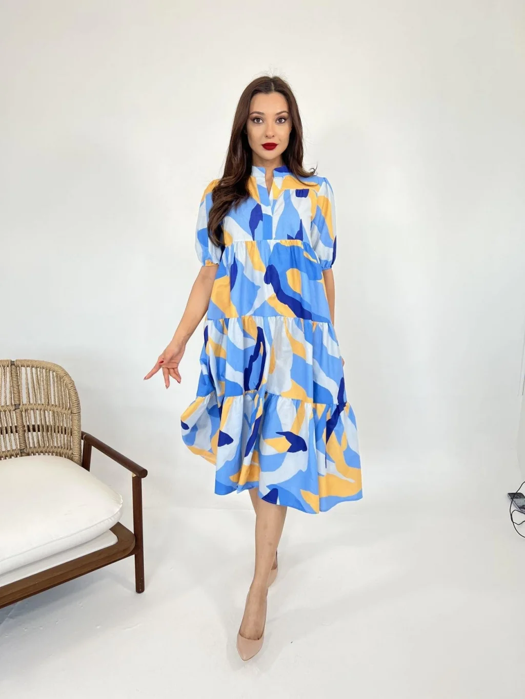Kadın Uzun Kollu Yakalı Yandan Bağlamalı Mini Desenli Modal Elbise