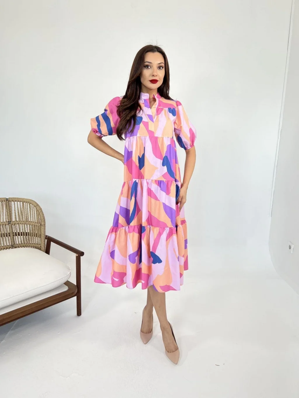 Kadın Uzun Kollu Yakalı Yandan Bağlamalı Mini Desenli Modal Elbise