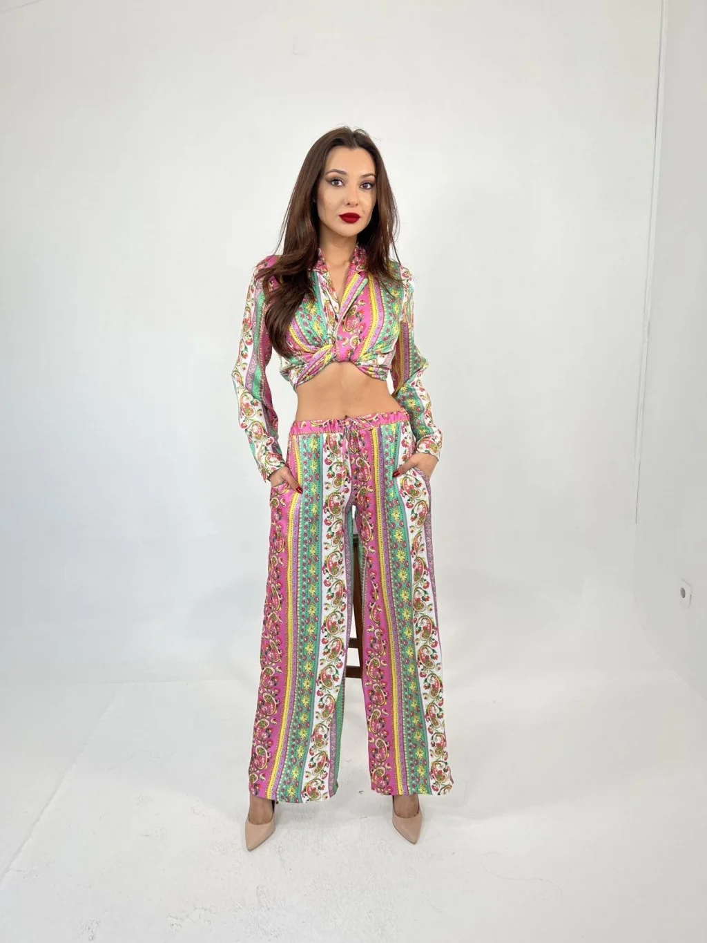 Kadın Krep Kumaş Gömlek Ve Ispanyol Paça Pantolon Ikili Takım