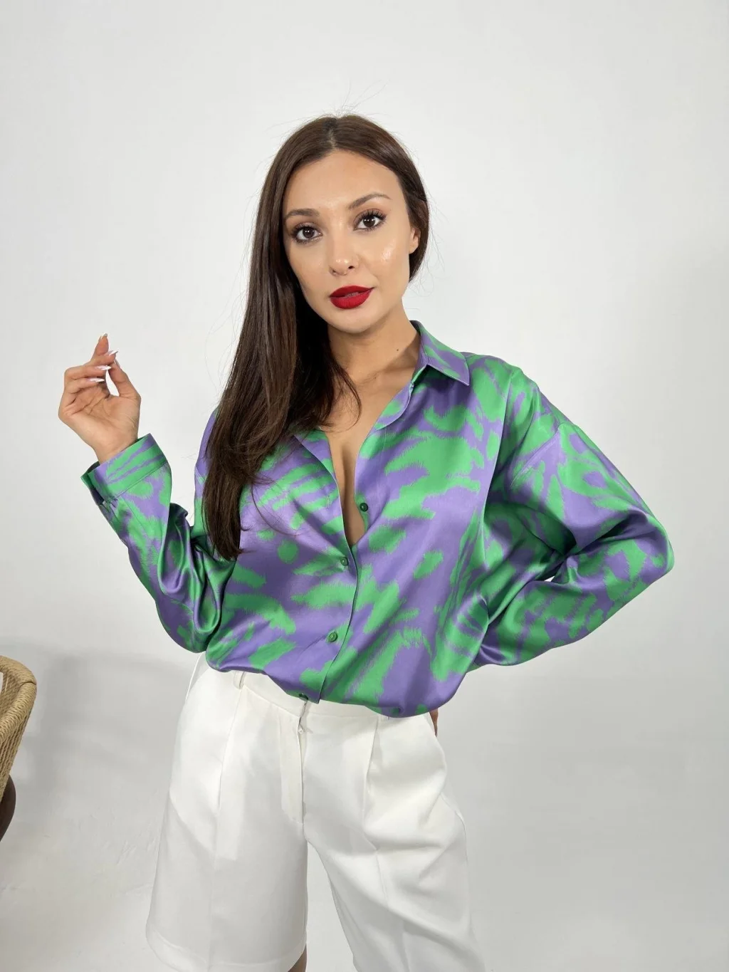 Kadın Uzun Kollu V Yaka Düğme Detaylı Yumoş Bluz