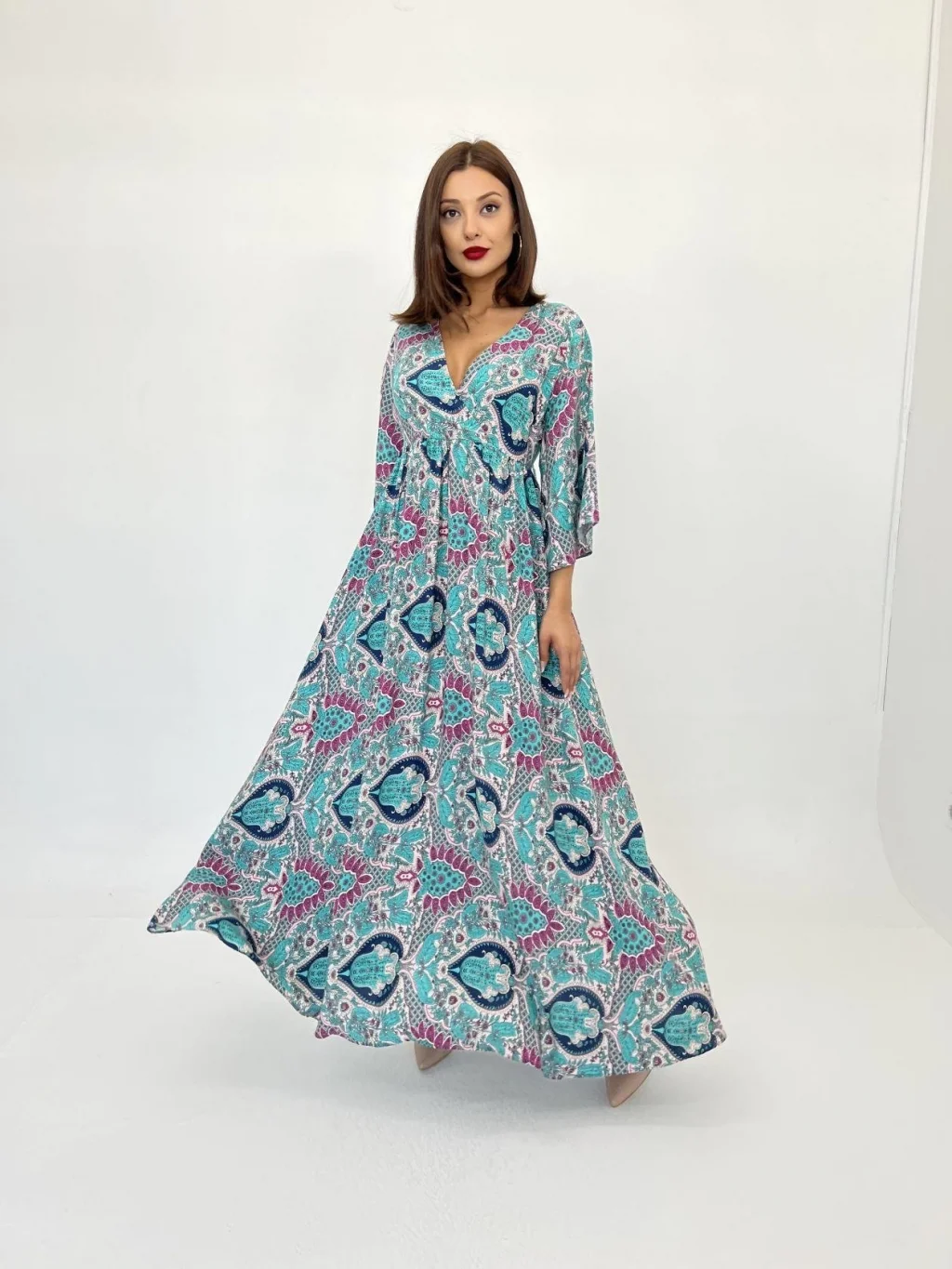 Kadın Uzun Kollu Kruvaze Yakalı Desenli Süprem Maxi Elbise