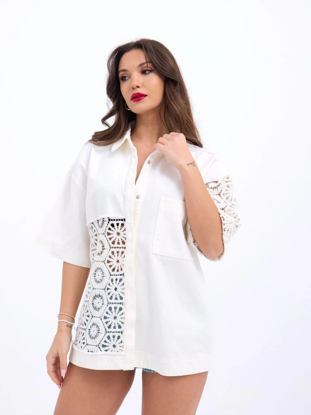 Kadın Kısa Kollu V Yakalı önden Düğmeli Dokuma Gömlek