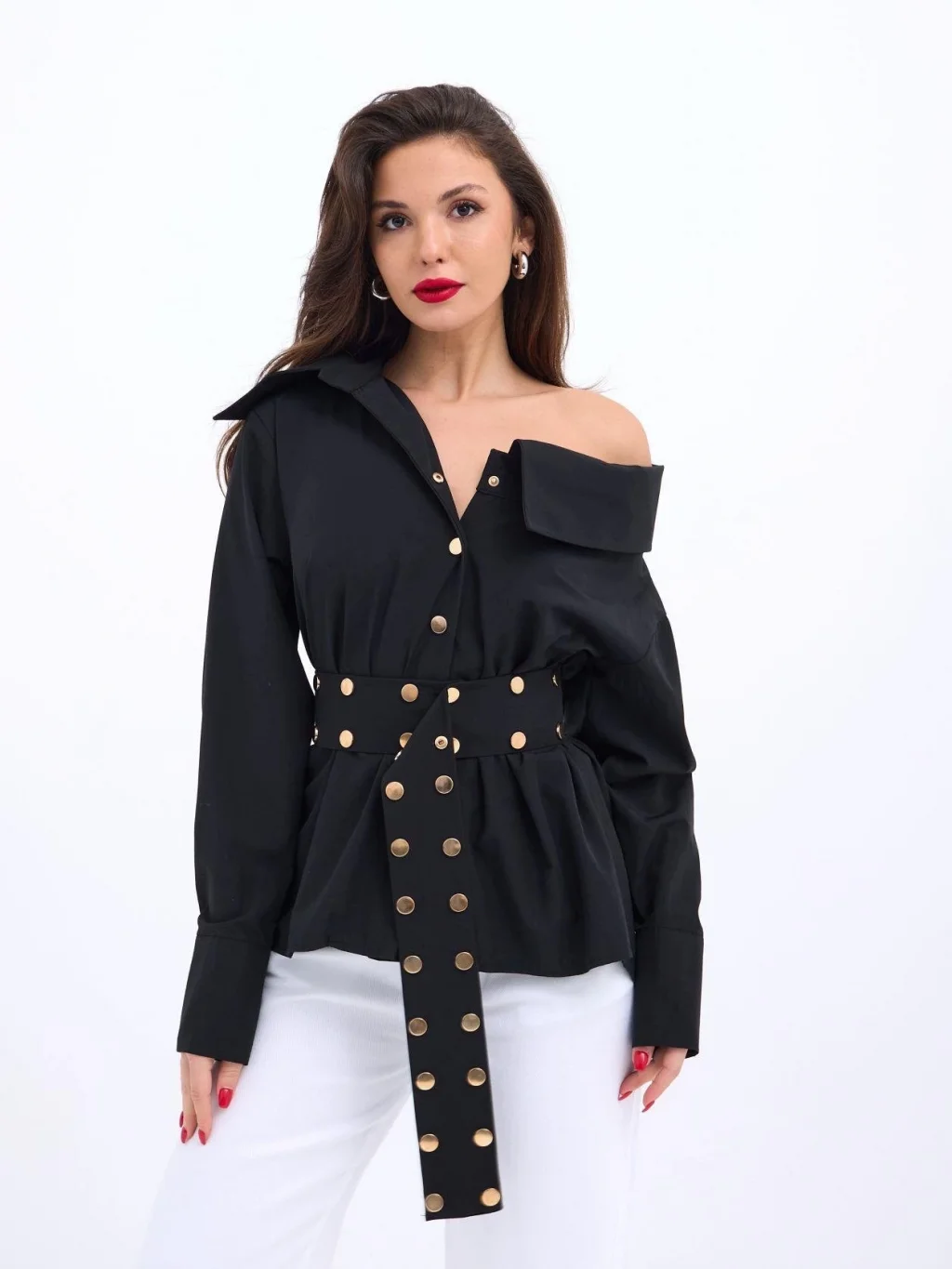 Kadın Dokuma Viskon Kumaş V Yaka Dekolte Ve Metal Düğme Detaylı Gömlek