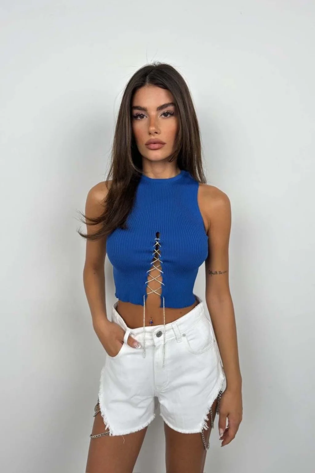 <p>Taş Detay Dekolteli Crop Bluz</p><br> <p>Modelin Ölçüleri: Boy:165, Kg:55, Göğüs:90, Bel:72, Kalça: 100</p><br> <p>Modelin üzerindeki ürün M/38 bedendir</p><br> <ul> </ul>