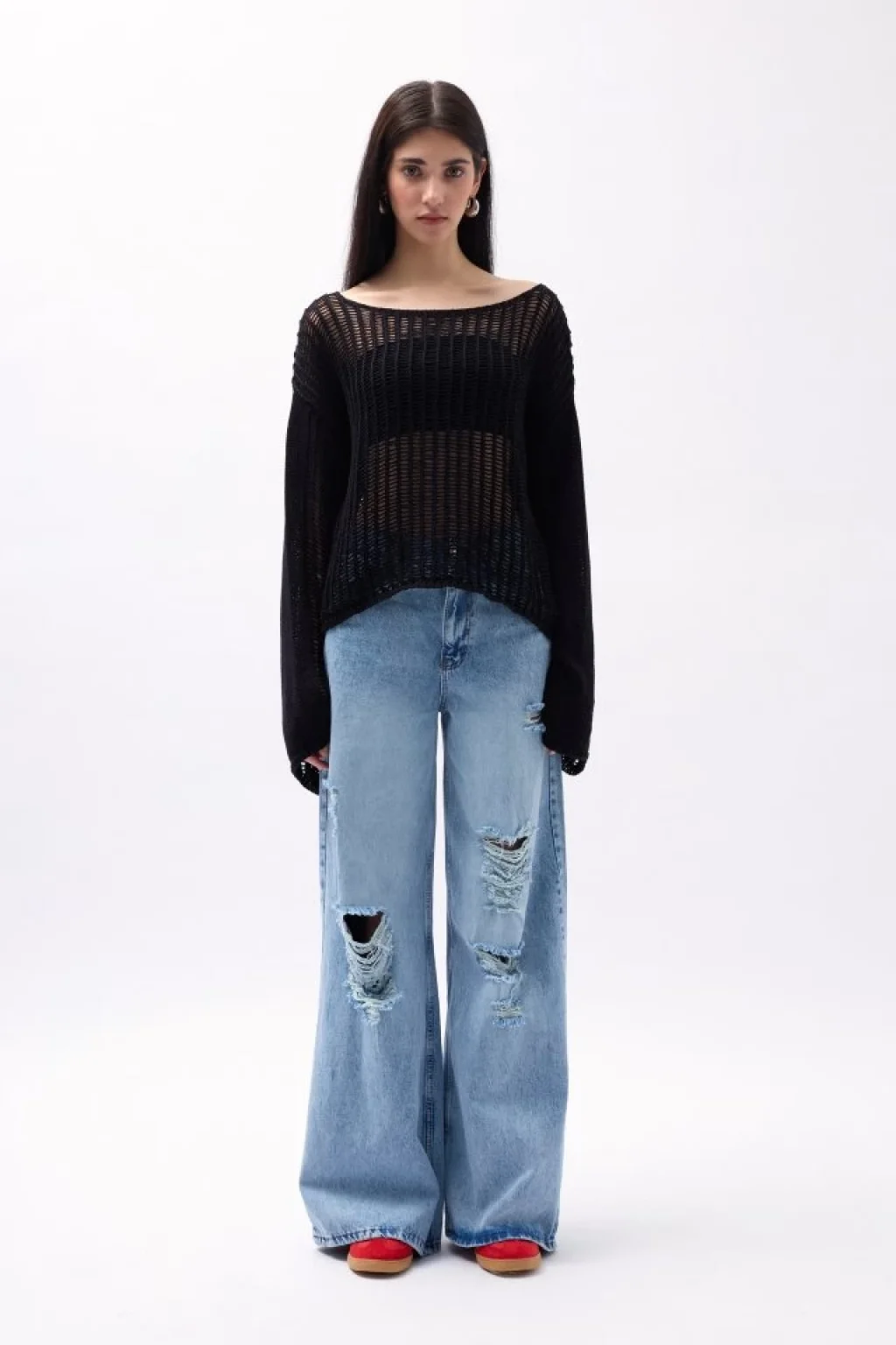 Kadın Uzun Kollu Omuzlardan Açık Askılı Yuvarlak Yaka Triko Bluz