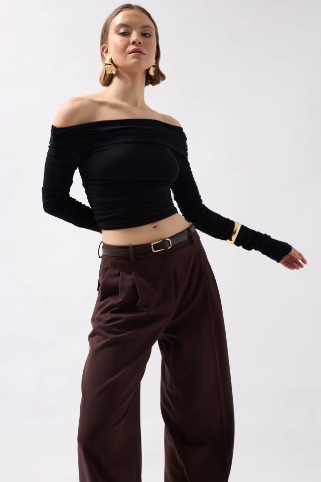 Kadın Uzun Kollu Omuzlardan Açık Askılı Yuvarlak Yaka Triko Bluz