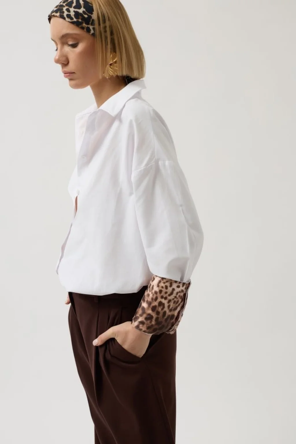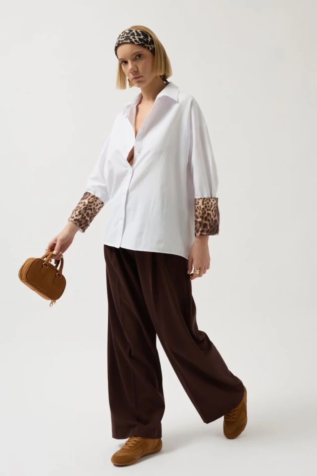 Kadın Uzun Kol Cep Detay Leopar Baskılı Mosskrep Kumaş Gömlek