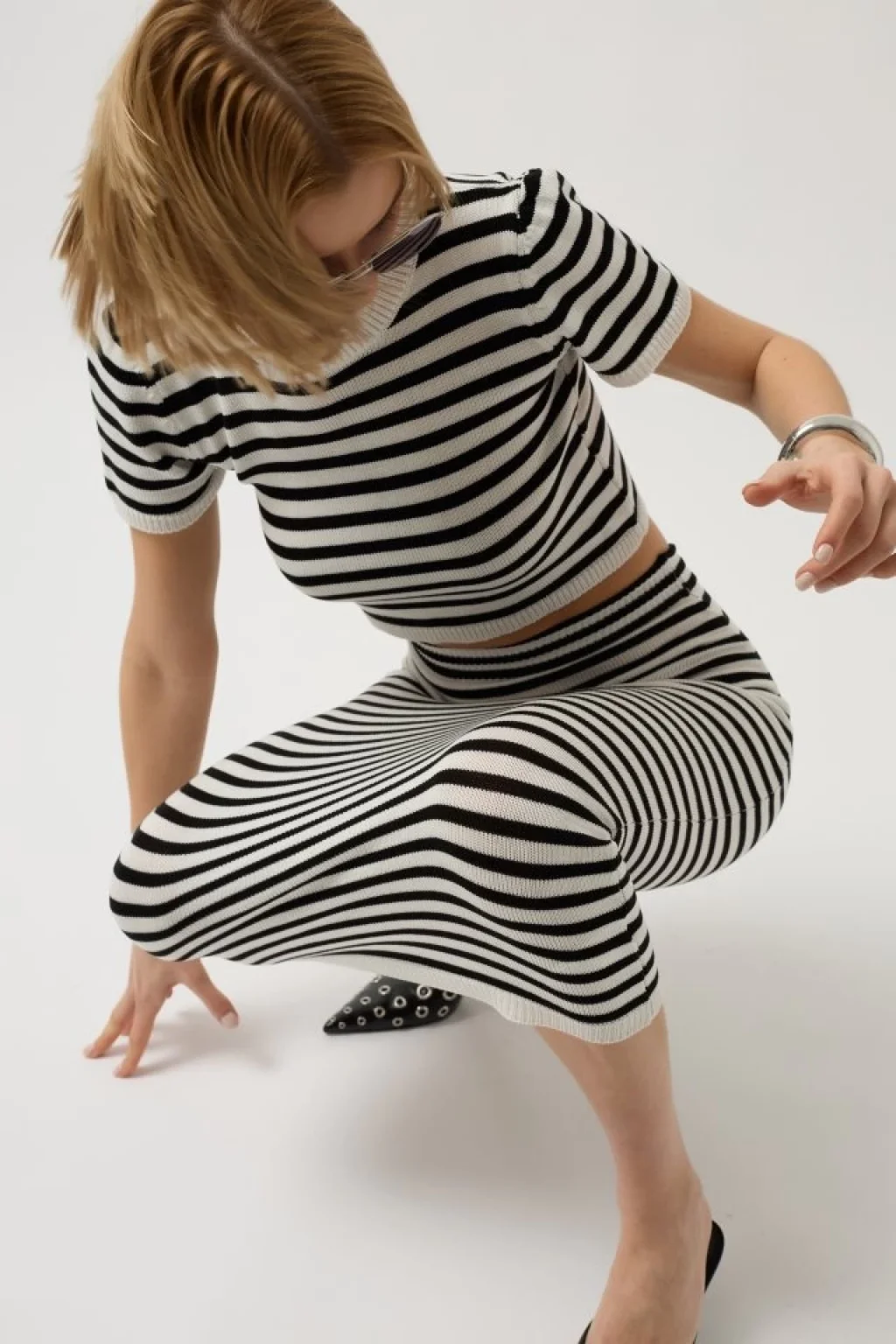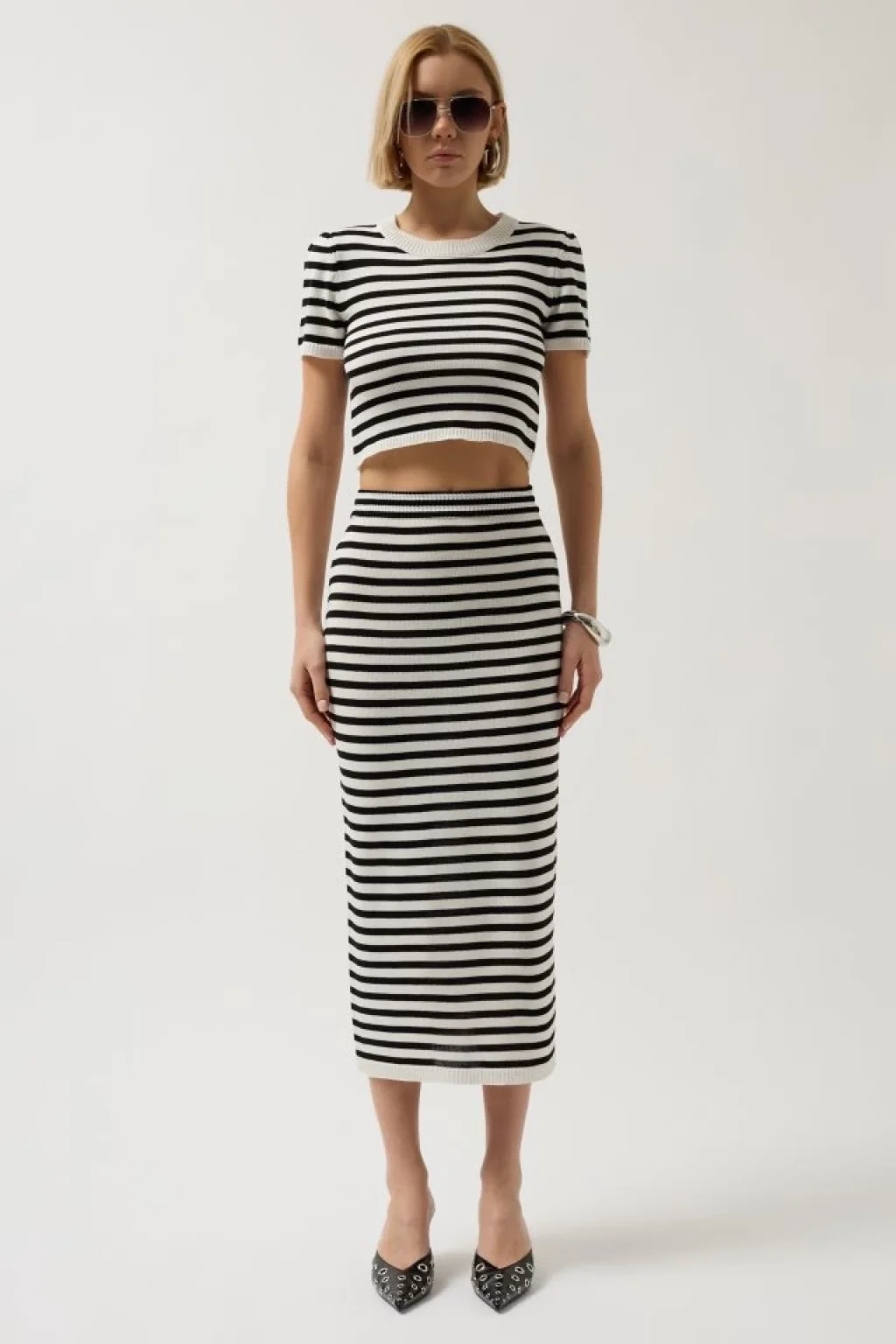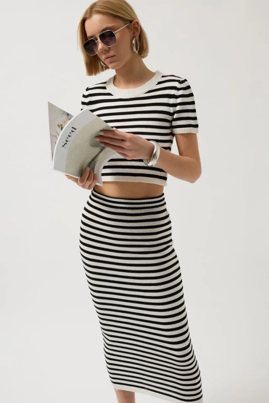 <p>Çizgili Midi Dokulu Etek</p><br> <p>Modelin Ölçüleri: Boy:165, Kg:55, Göğüs:90, Bel:72, Kalça: 100</p><br> <p>Modelin üzerindeki ürün M/38 bedendir</p><br> <ul> </ul>