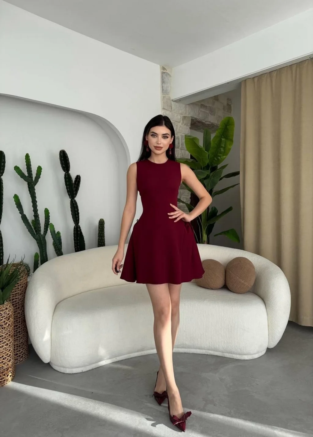 Kadın Uzun Kollu Yuvarlak Yaka Pileli Salaş Mini Ithal Krep Elbise