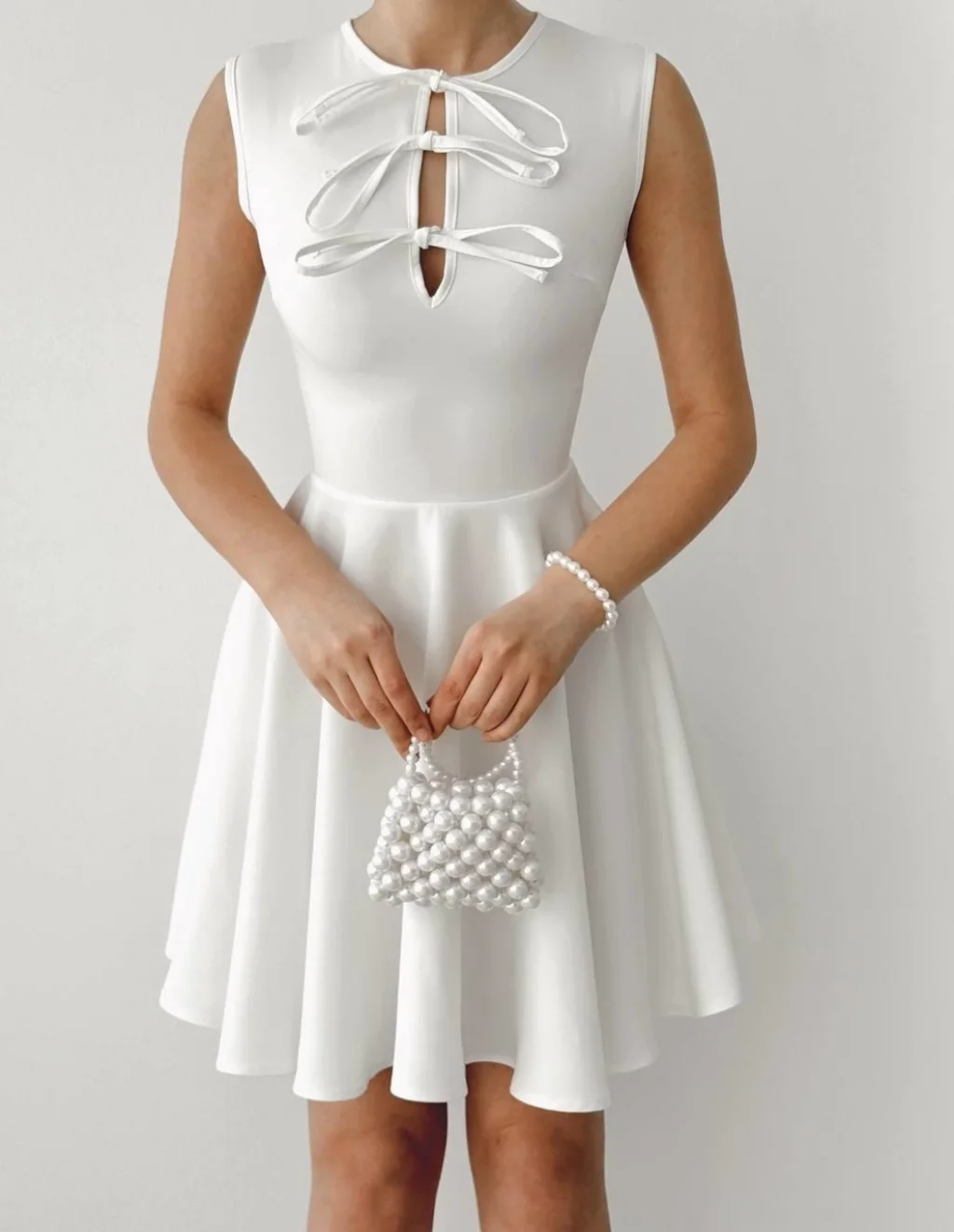 Kadın Uzun Kollu Omuzdan Açık V Dantel Yakalı Mini Waffle Elbise