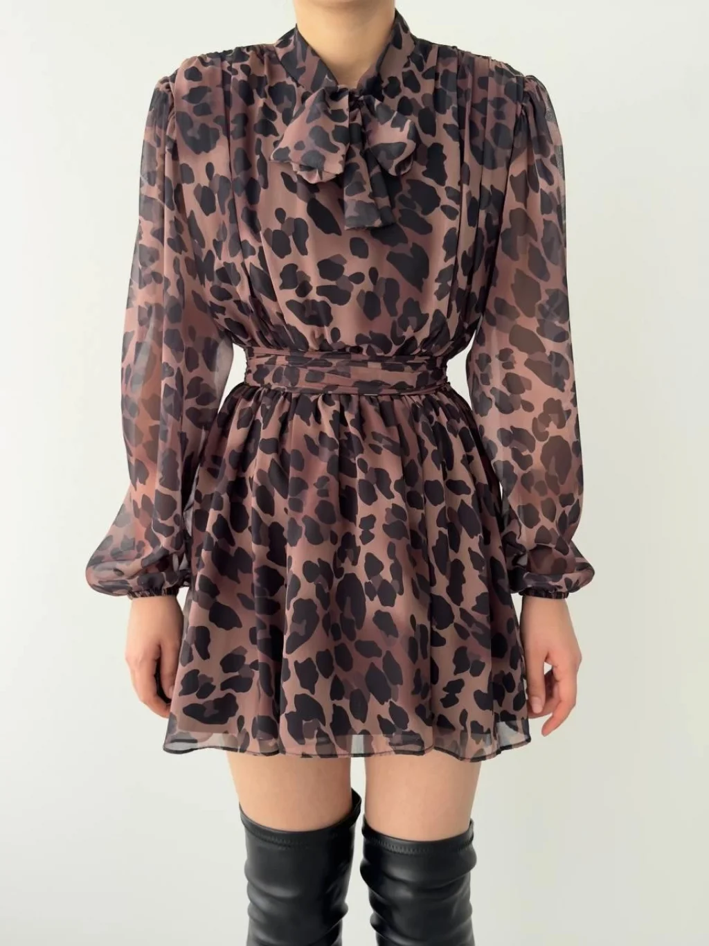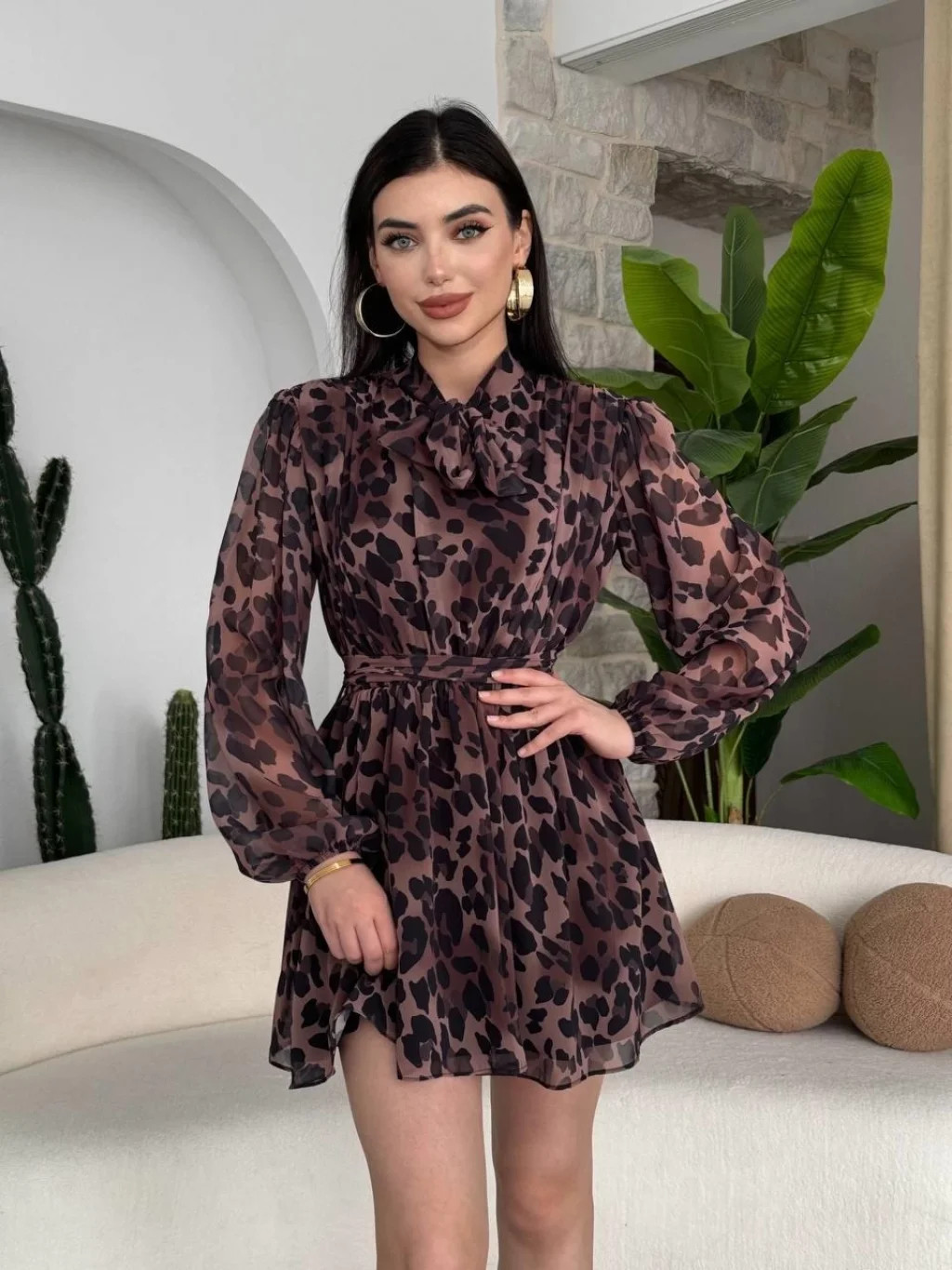 Kadın Uzun Kollu Kruvaze Yakalı Fırfırlı Belden Kuşaklı Leopar Desen Modal Elbise