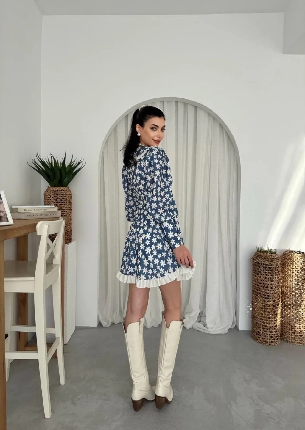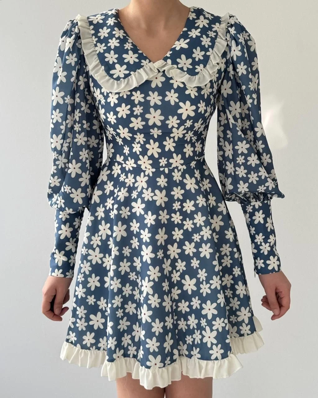 Kadın Uzun Kollu Yakalı Yandan Bağlamalı Mini Desenli Modal Elbise