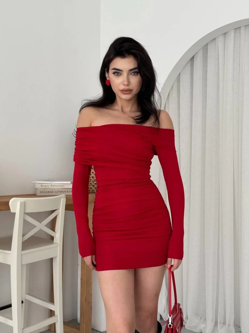Kadın Uzun Kollu Yuvarlak Yaka Pileli Salaş Mini Ithal Krep Elbise