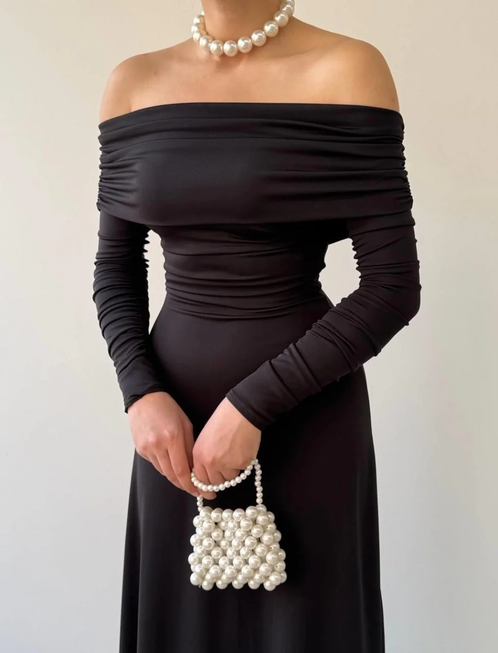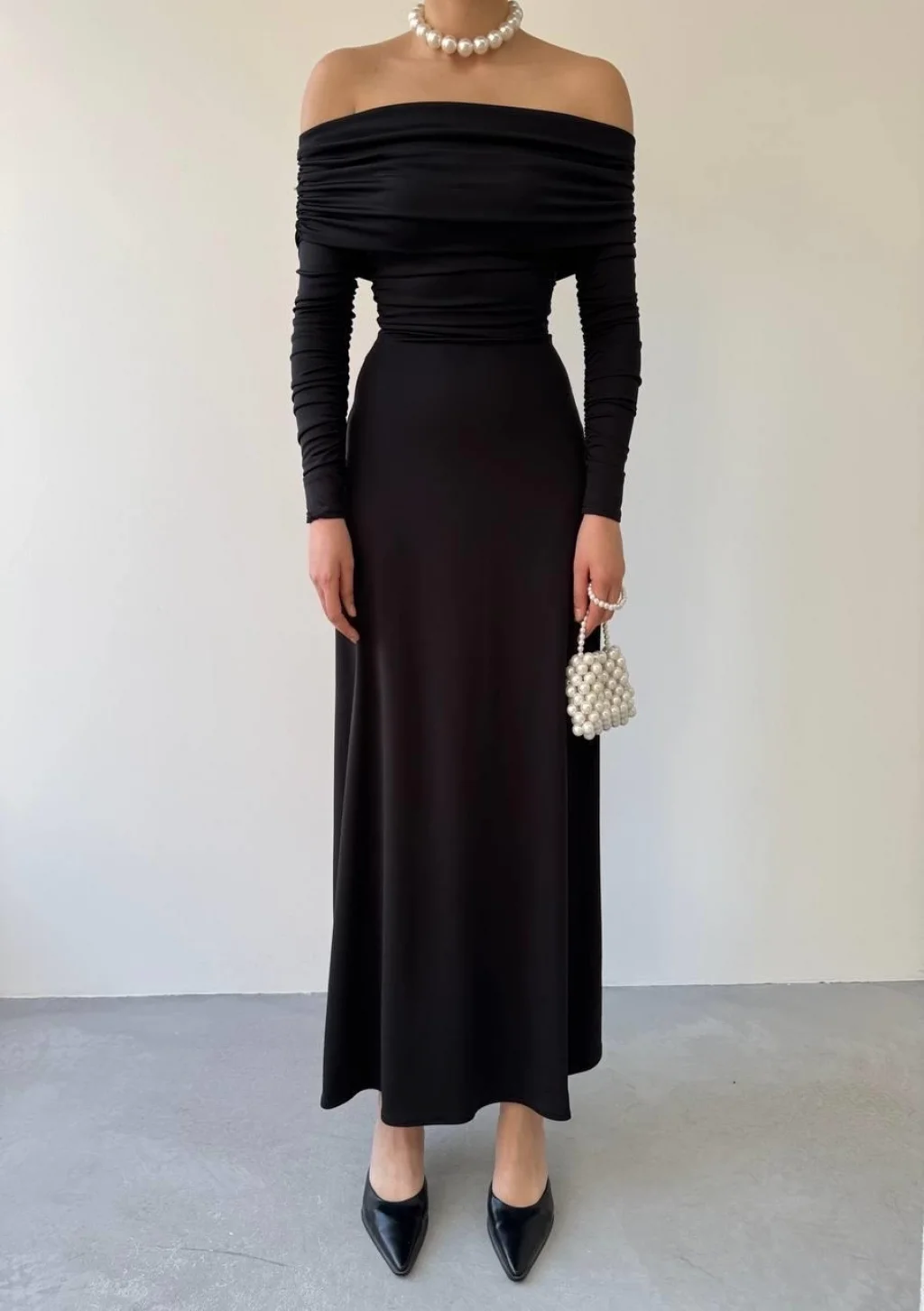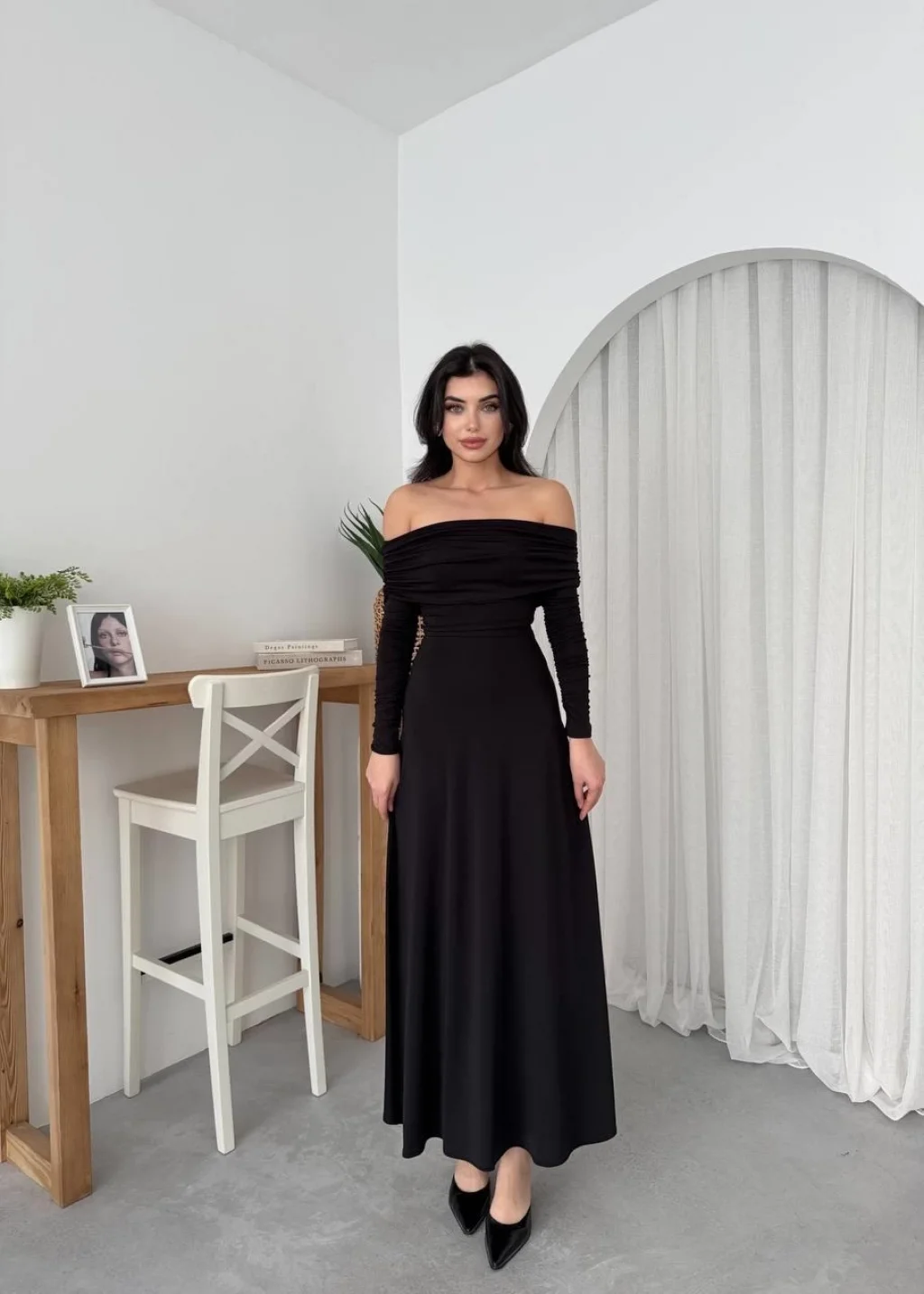 Kadın Uzun Kollu Geometrik Yaka Midi Ithal Krep Elbise