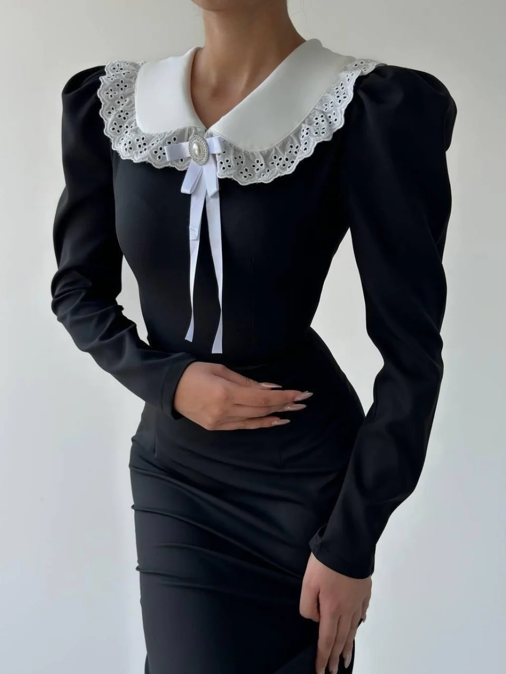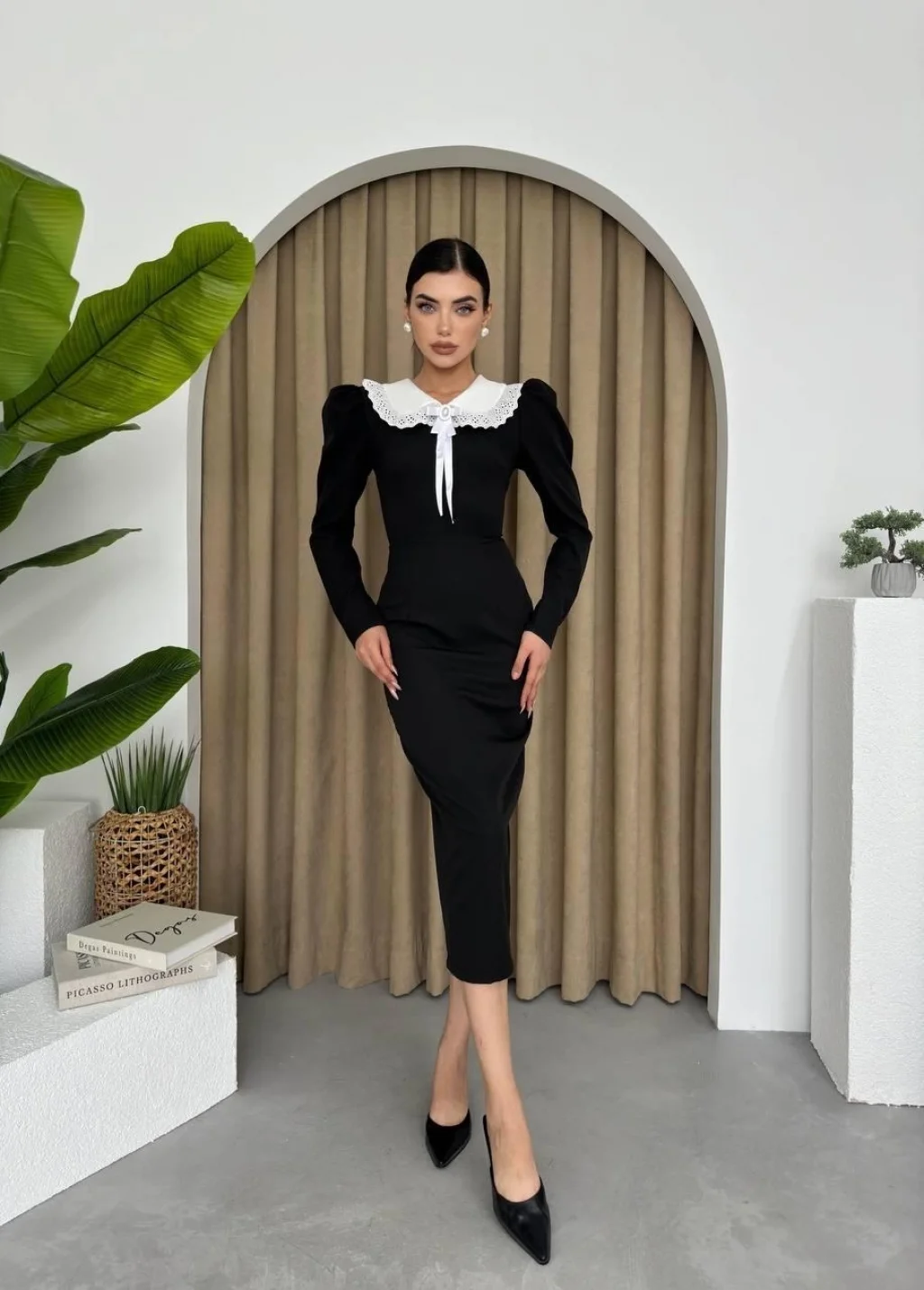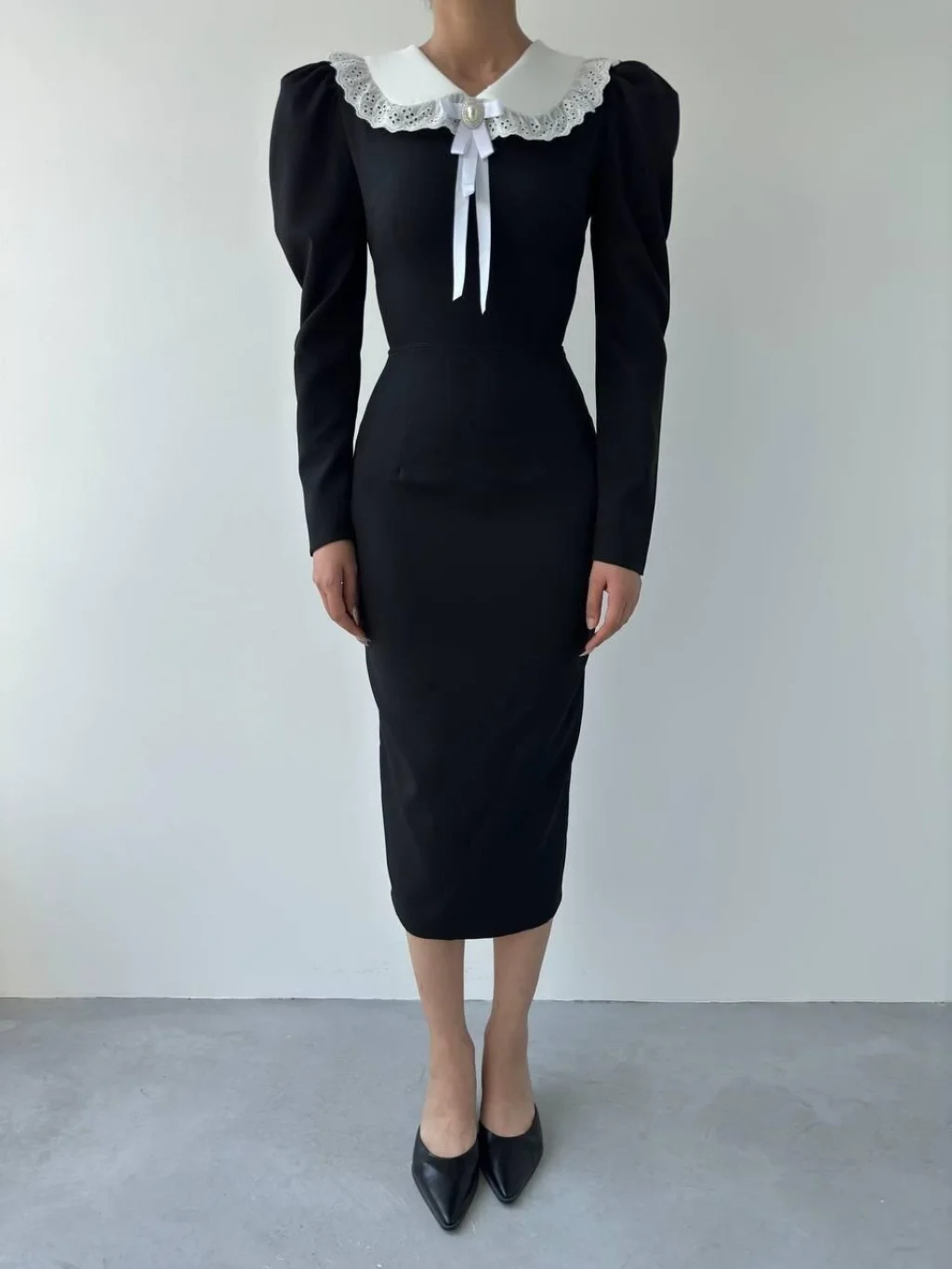 Kadın Uzun Kollu Geometrik Yaka Midi Ithal Krep Elbise