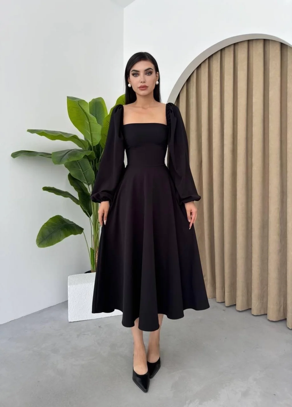 Kadın Uzun Kollu Geometrik Yaka Midi Ithal Krep Elbise