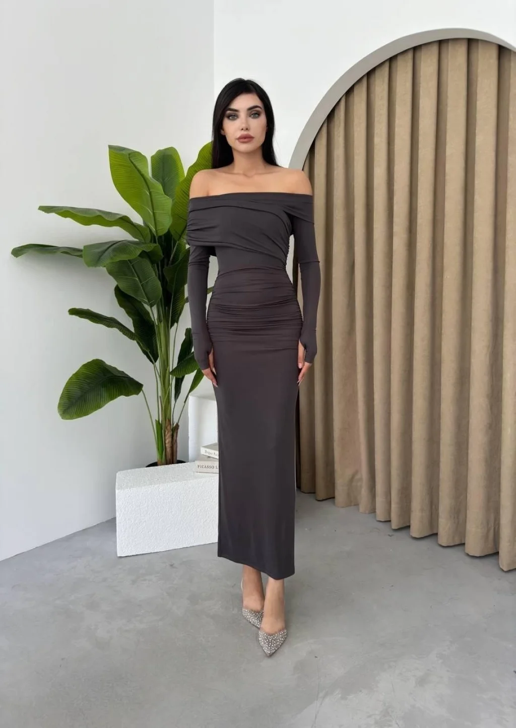 Kadın Uzun Kollu Geometrik Yaka Midi Ithal Krep Elbise