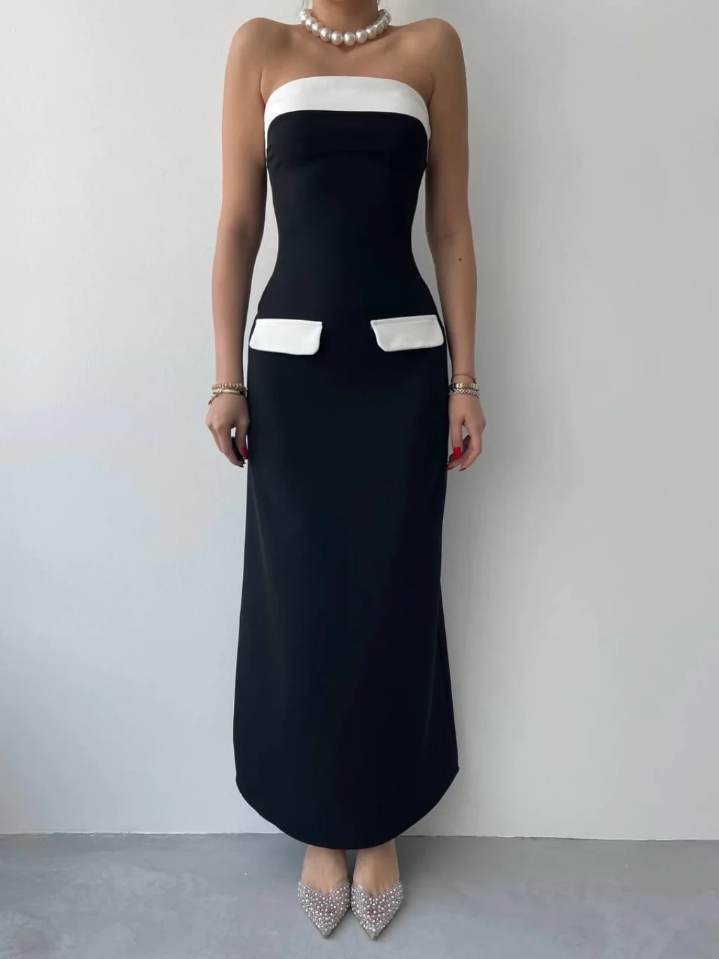 Cep Detaylı Straplez Elbise