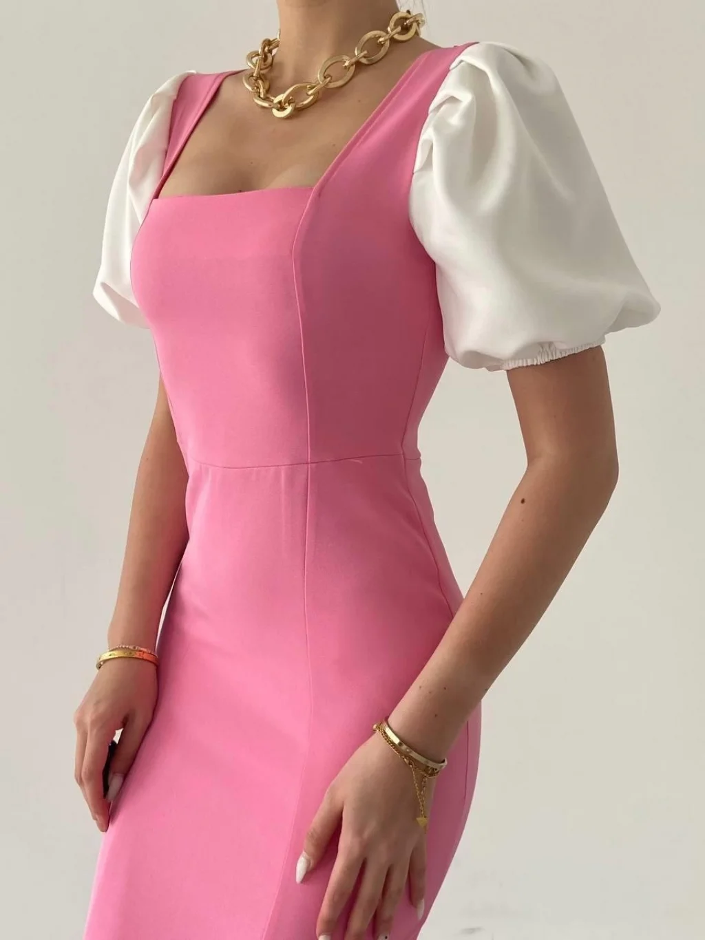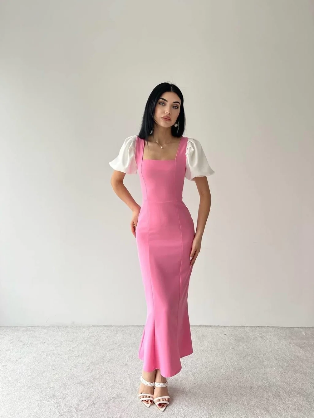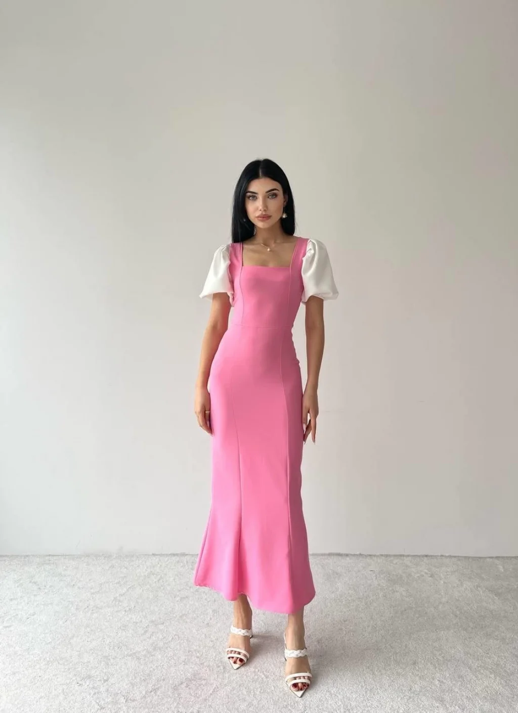 Kadın Uzun Kollu Geometrik Yaka Midi Ithal Krep Elbise