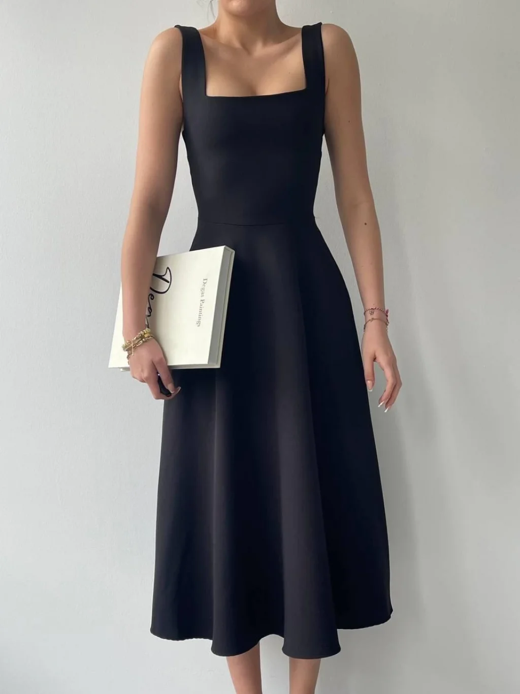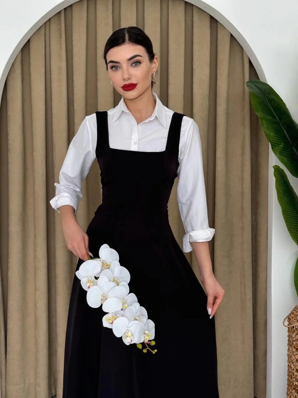 Kadın Uzun Kollu Geometrik Yaka Midi Ithal Krep Elbise