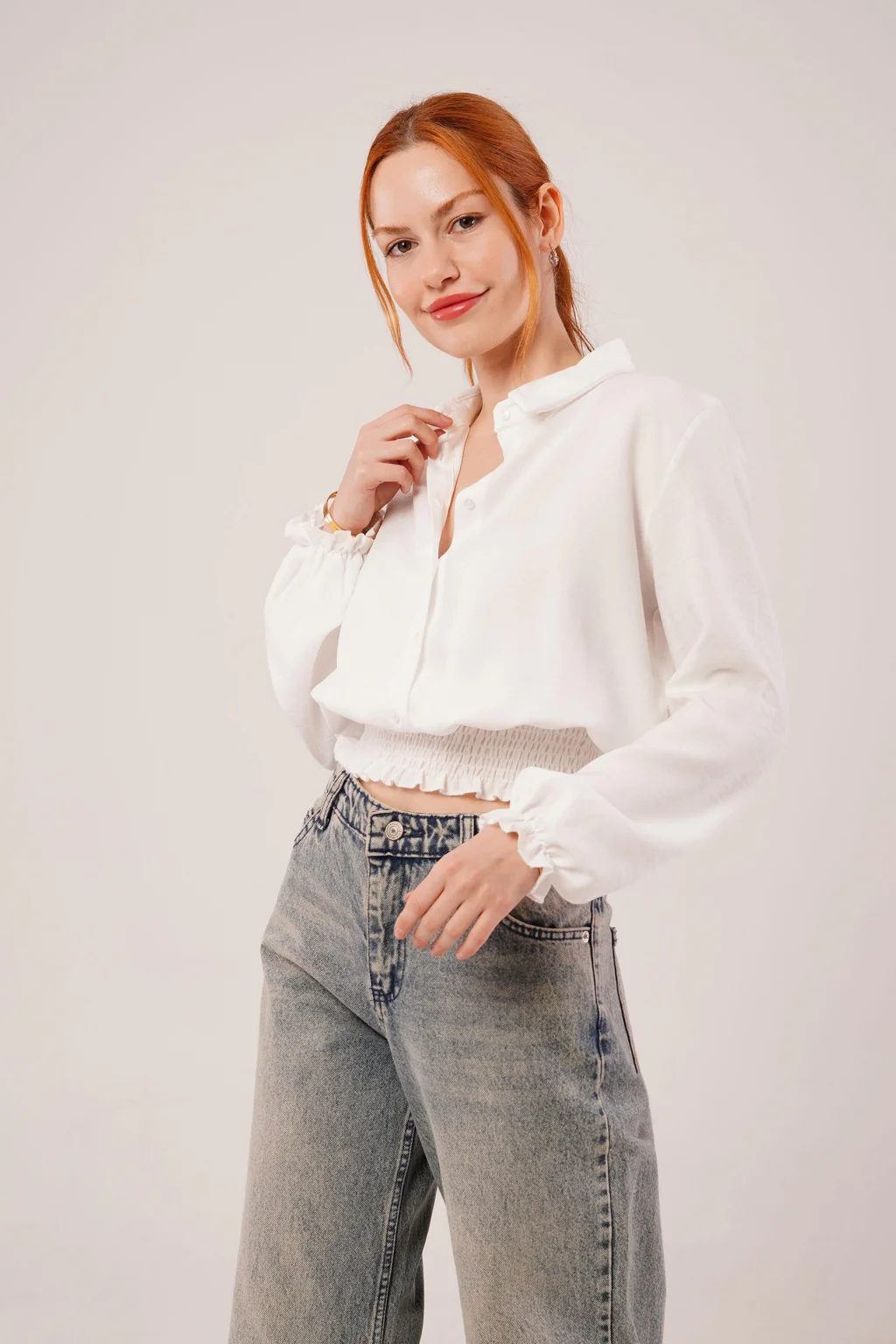 Bel Ve Bilek Lastikli Beyaz Bluz
