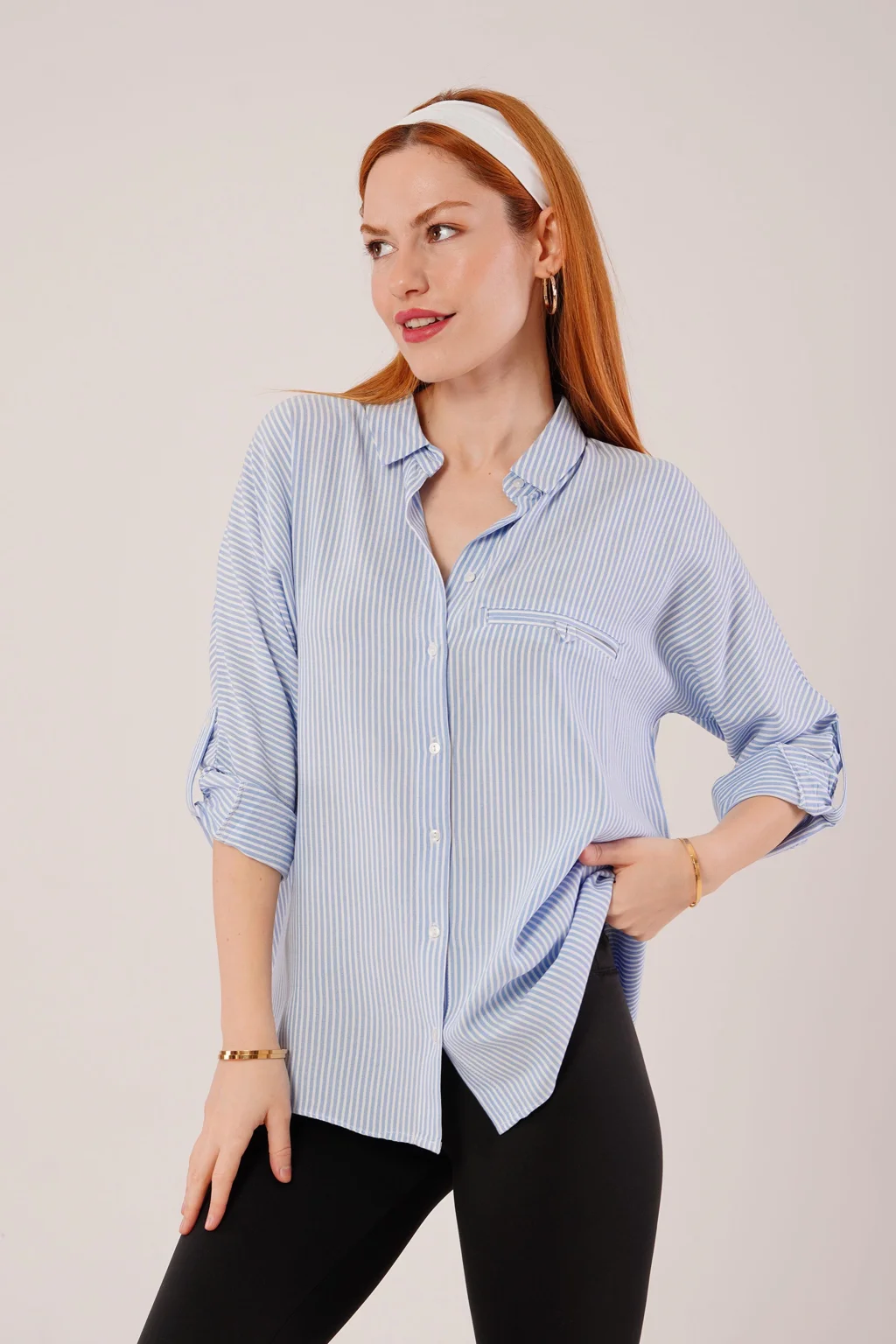 Cep Detay Çizgili Oversize Mavi Gömlek