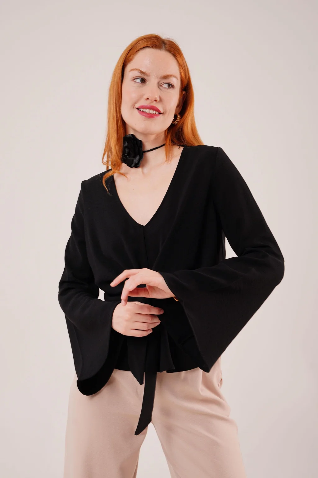 Kadın Uzun Kollu Yakadan Bağlamalı Viskon Iki Iplik Bluz
