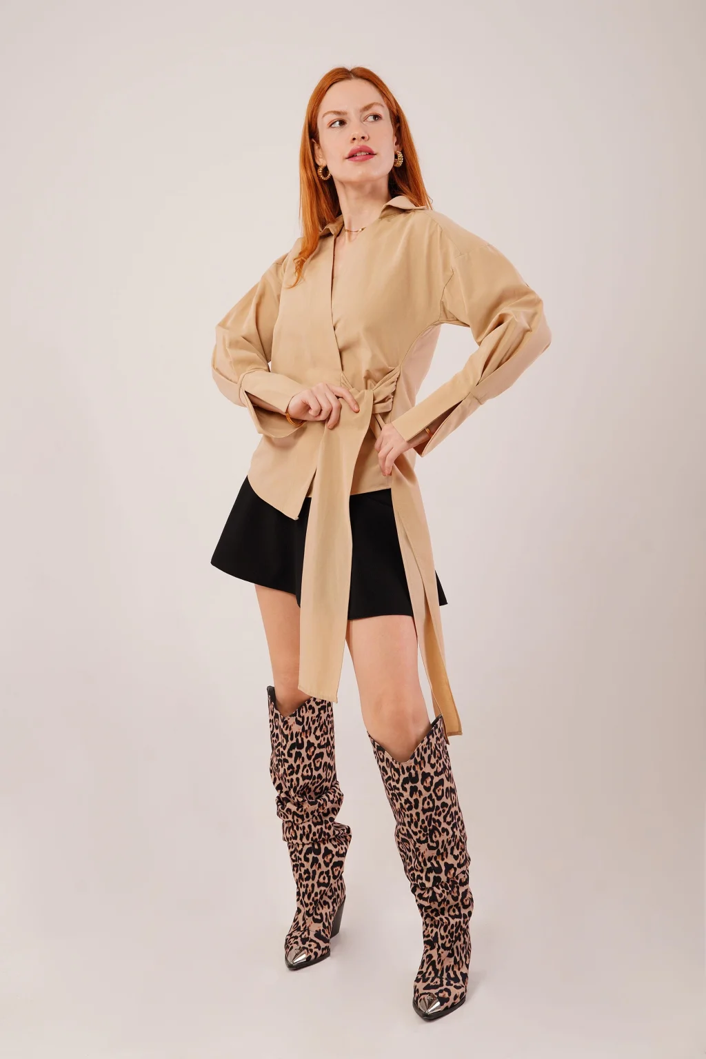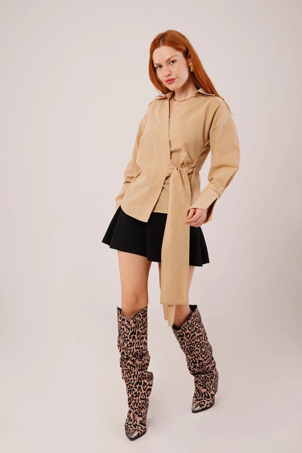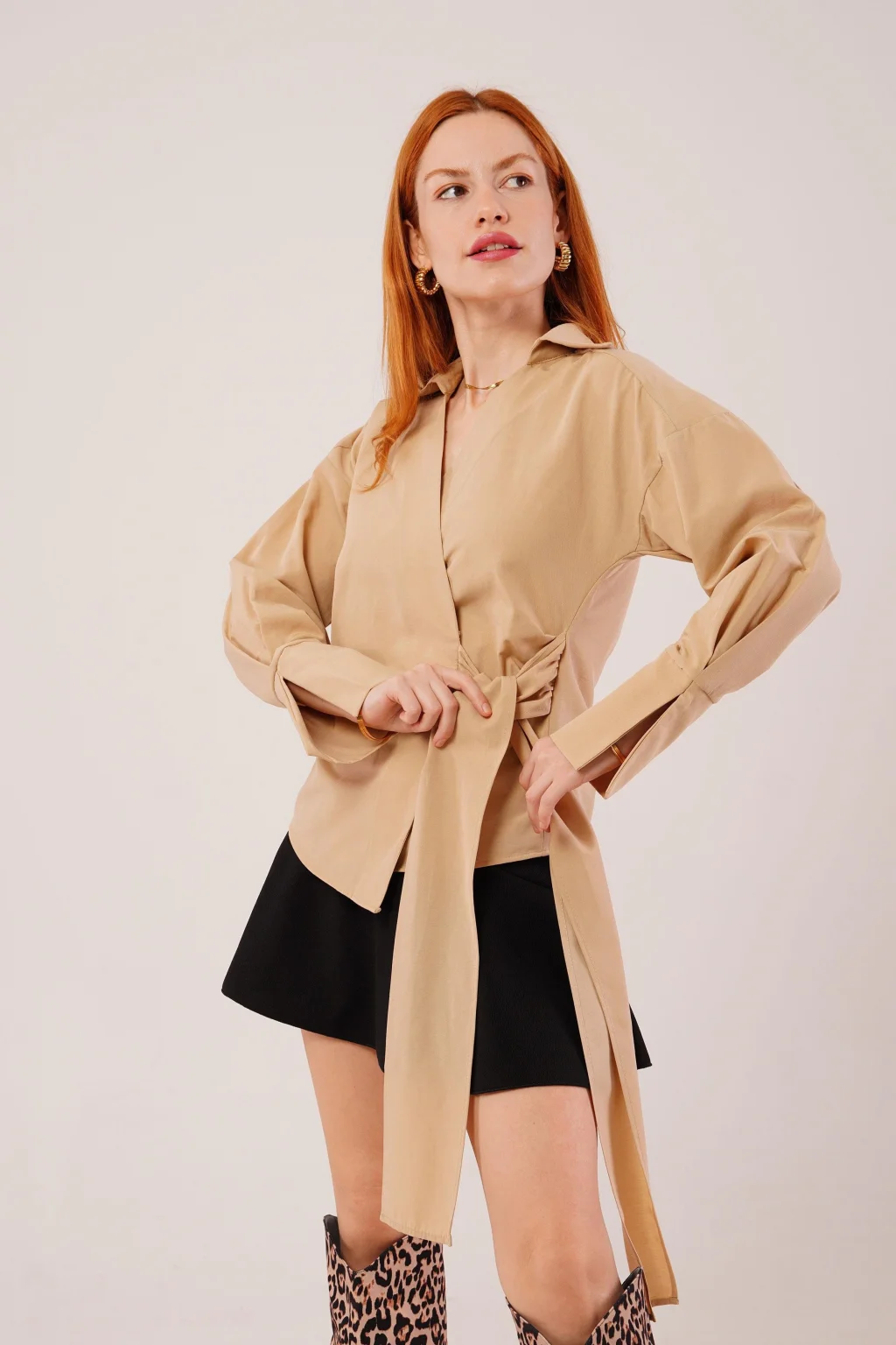 Kruvaze Yaka Yandan Bağlama Detaylı Camel Gömlek
