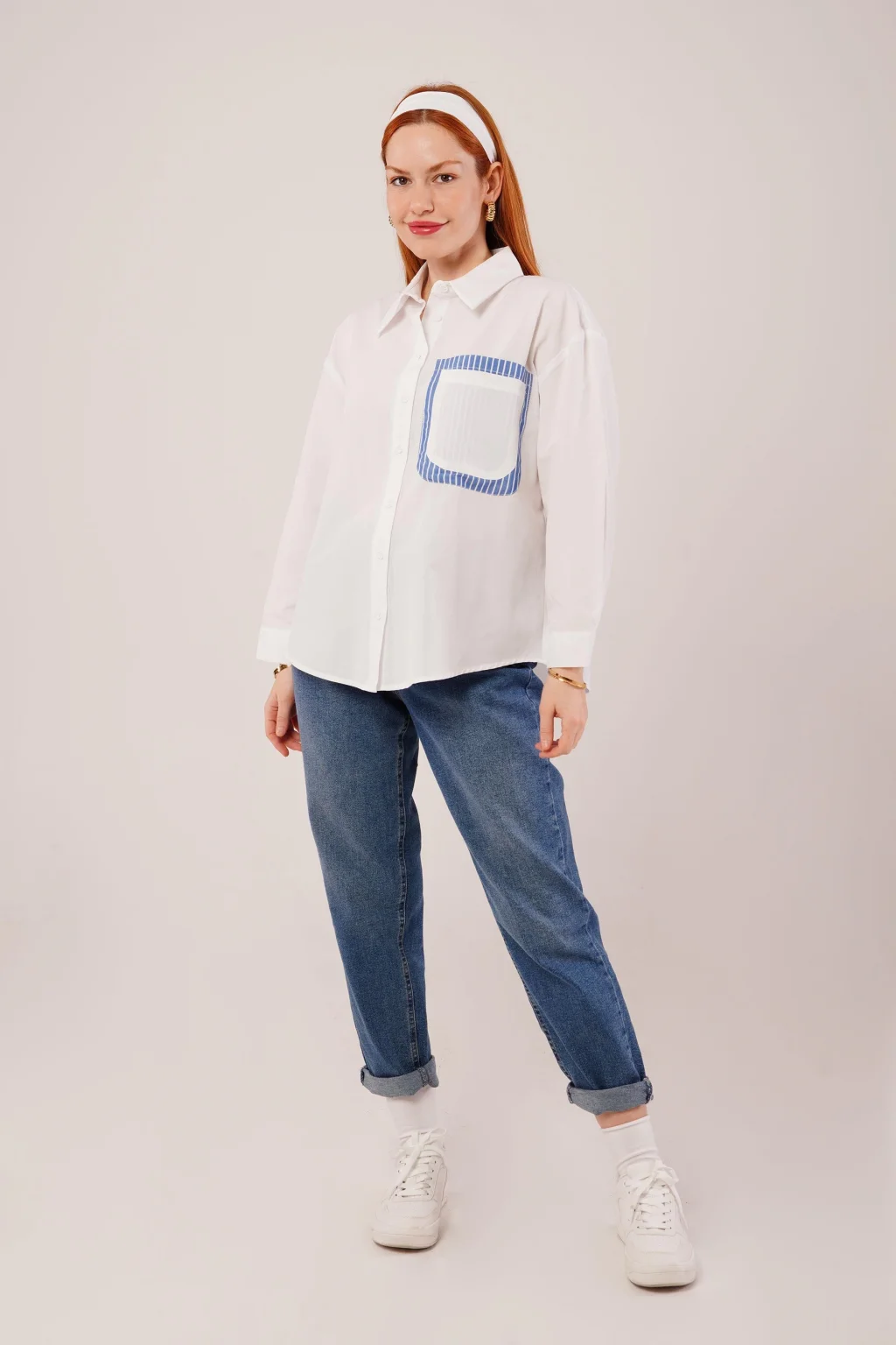 Çizgili Cep Detaylı Beyaz Gömlek