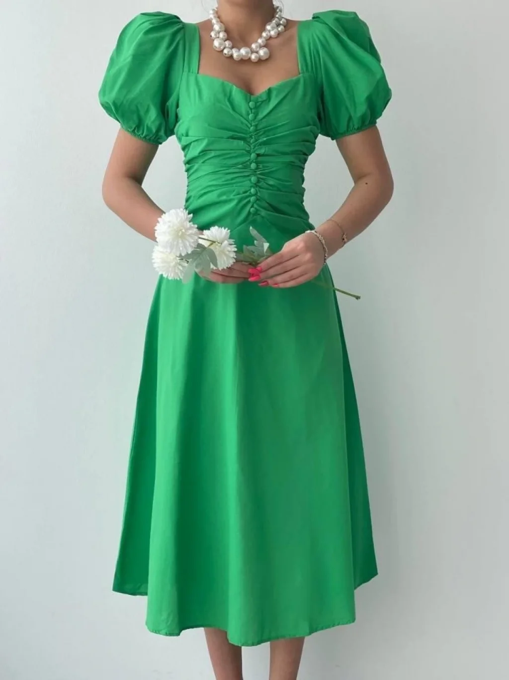 <p>Kare Yaka Düğmeli Elbise</p><br> <p>Modelin Ölçüleri: Boy:165, Kg:55, Göğüs:90, Bel:72, Kalça: 100</p><br> <p>Modelin üzerindeki ürün M/38 bedendir</p><br> <ul> </ul>