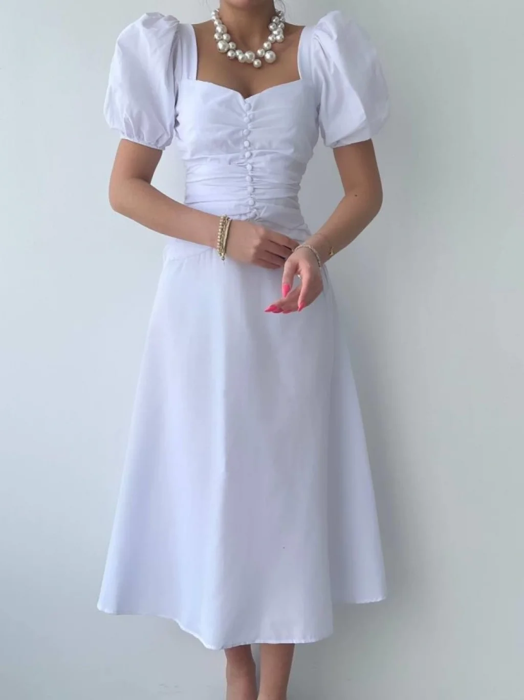 Kare Yaka Düğmeli Elbise