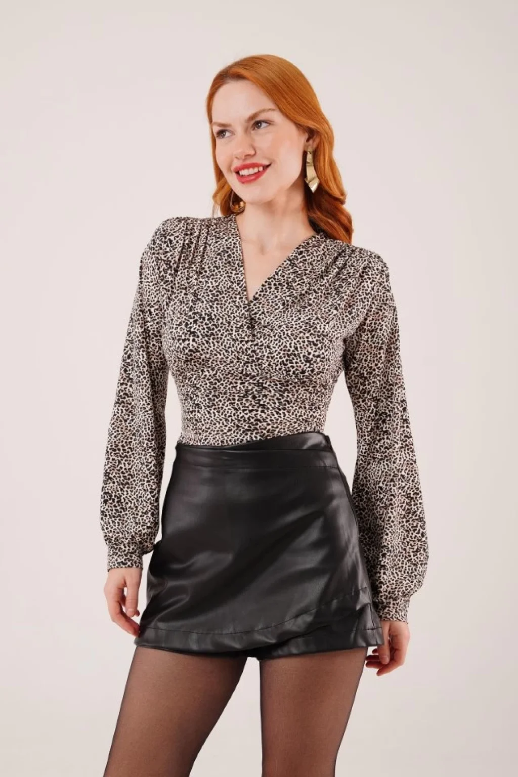 Kadın Uzun Kollu Yarı Balıkçı Yaka Leopar Detaylı Kaşkorse Bluz