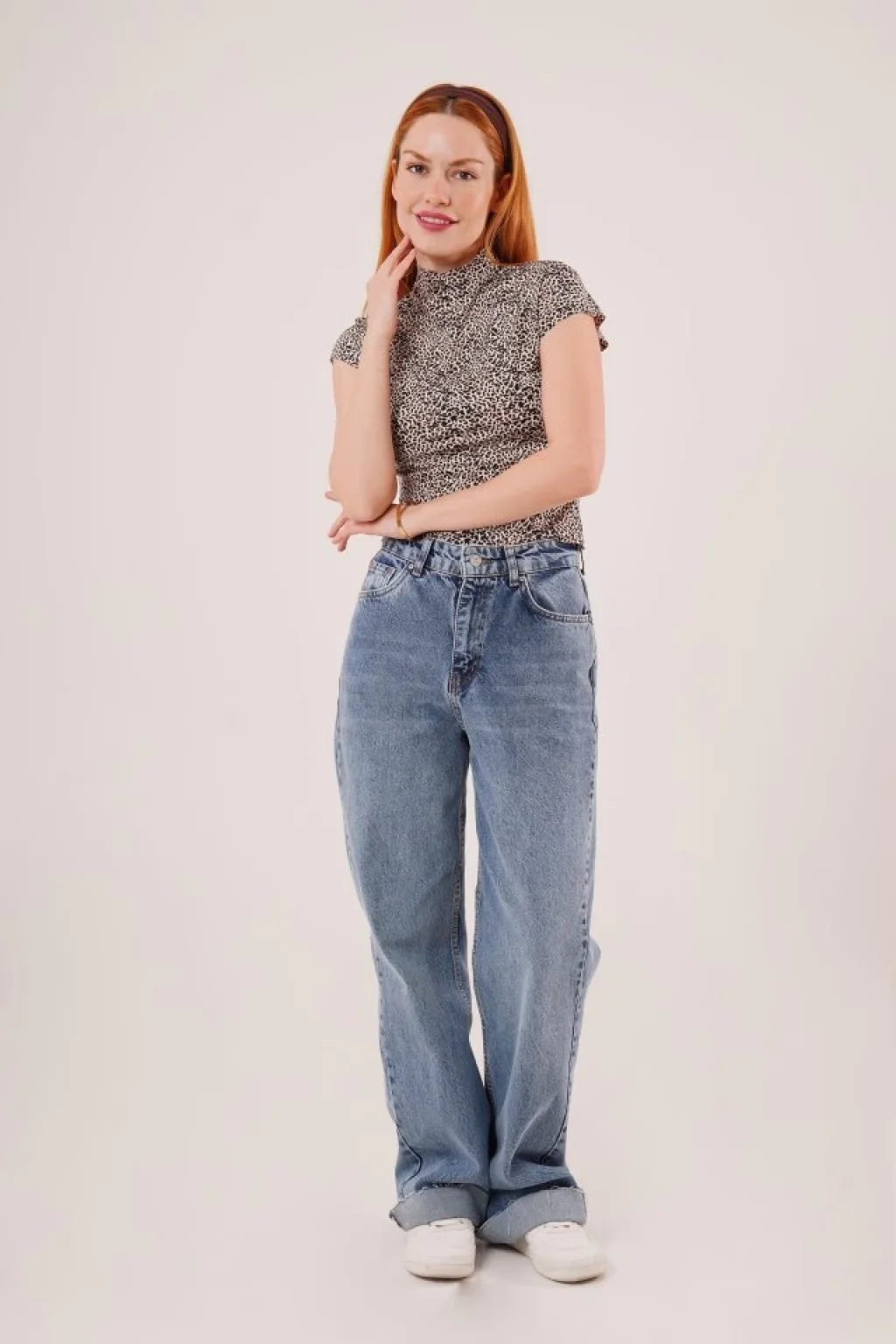 Kadın Uzun Kollu Yarı Balıkçı Yaka Leopar Detaylı Kaşkorse Bluz