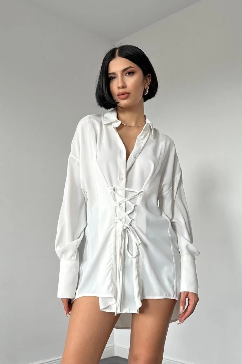 Beyaz Jesica Parçalı Bağcıklı Gömlek